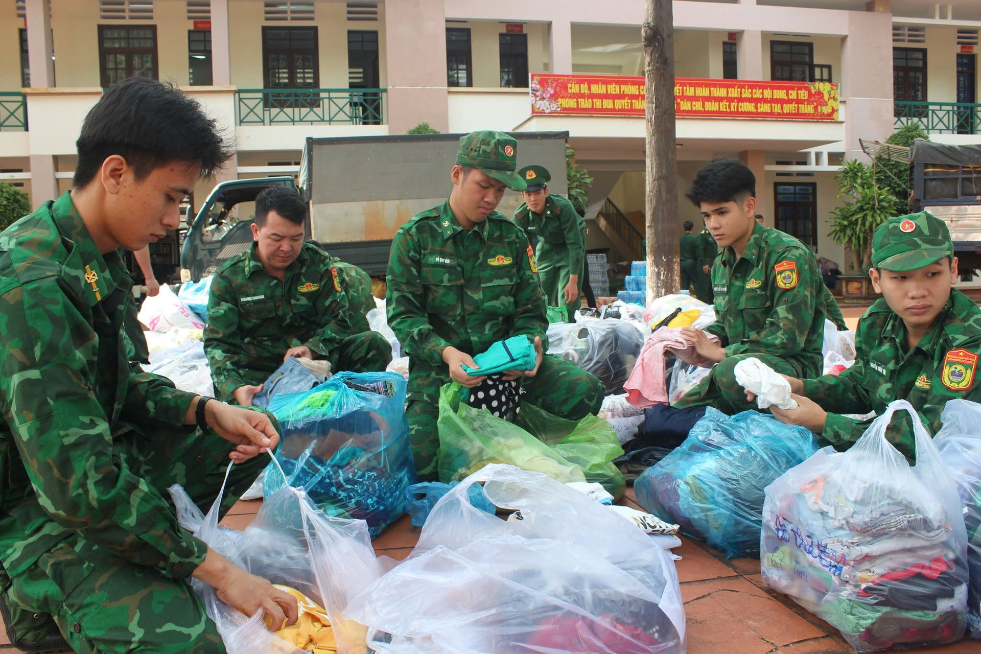 Người dân và cán bộ chiến sĩ làm nhiệm vụ tiếp nhận hàng cứu trợ đồng bào ảnh hưởng bão lũ tại Ban Chỉ huy Bộ đội Biên phòng tỉnh Đắk Lắk.