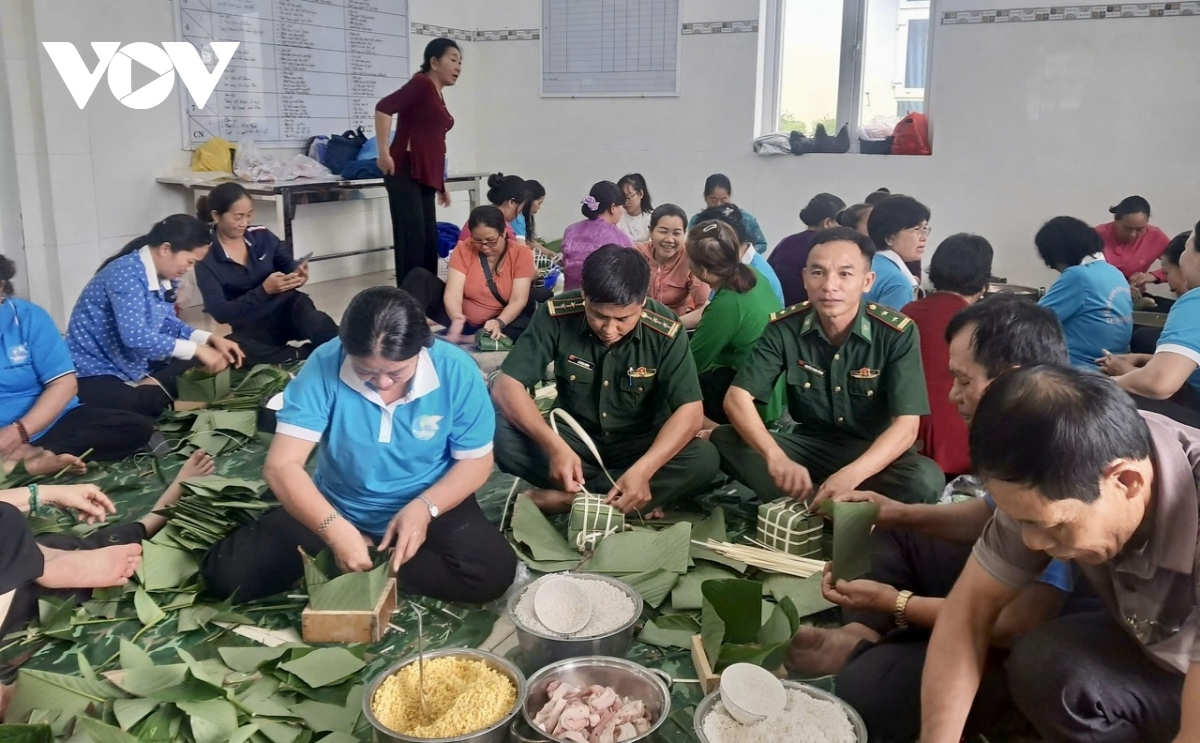 Cán bộ, chiến sĩ biên phòng cùng đại diện cấp ủy, chính quyền, các ban, ngành, đoàn thể địa phương tham gia gói bánh