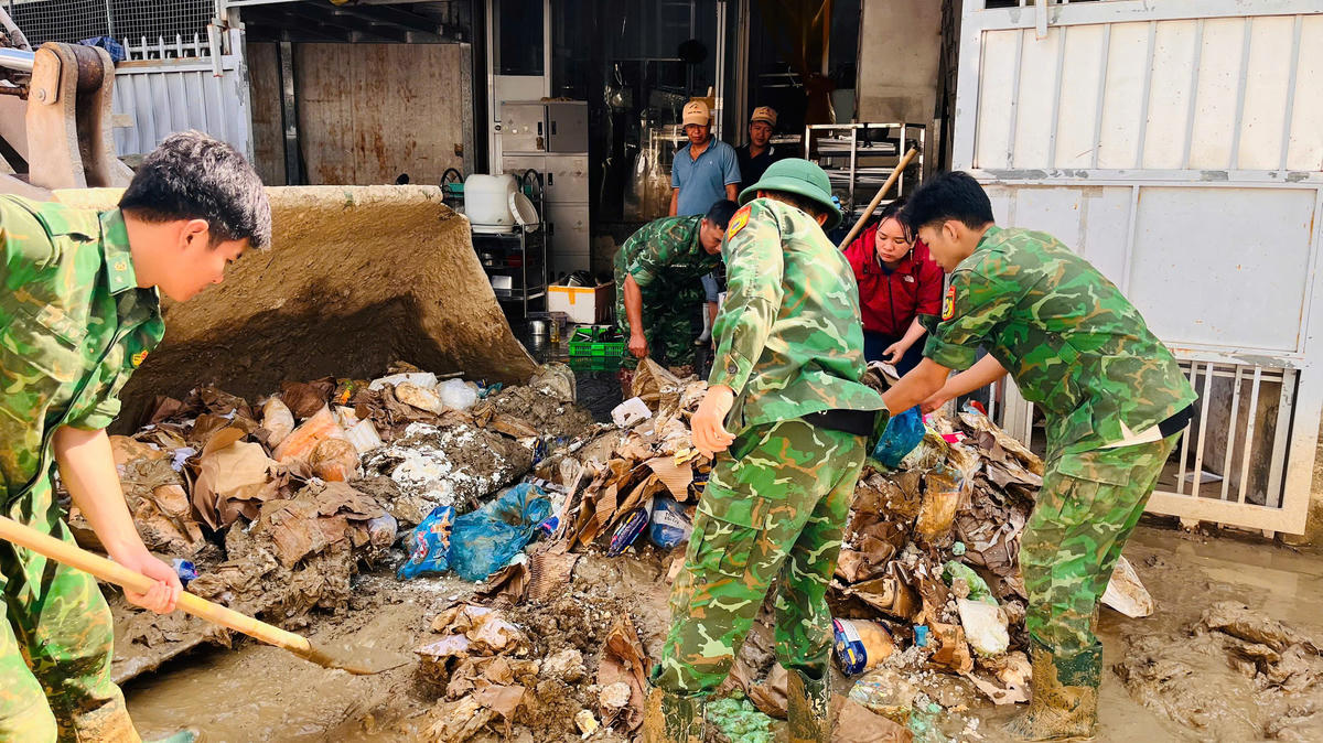 Bộ đội Biên phòng Khánh Hòa giúp dân dọn bùn đất, rác thải. Ảnh: Văn Tân.