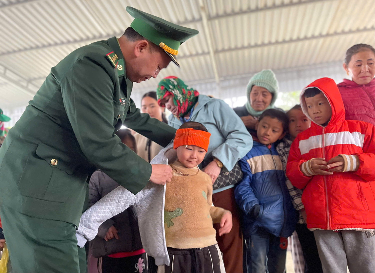 Bộ đội Biên phòng tận tình mặc áo cho em nhỏ.