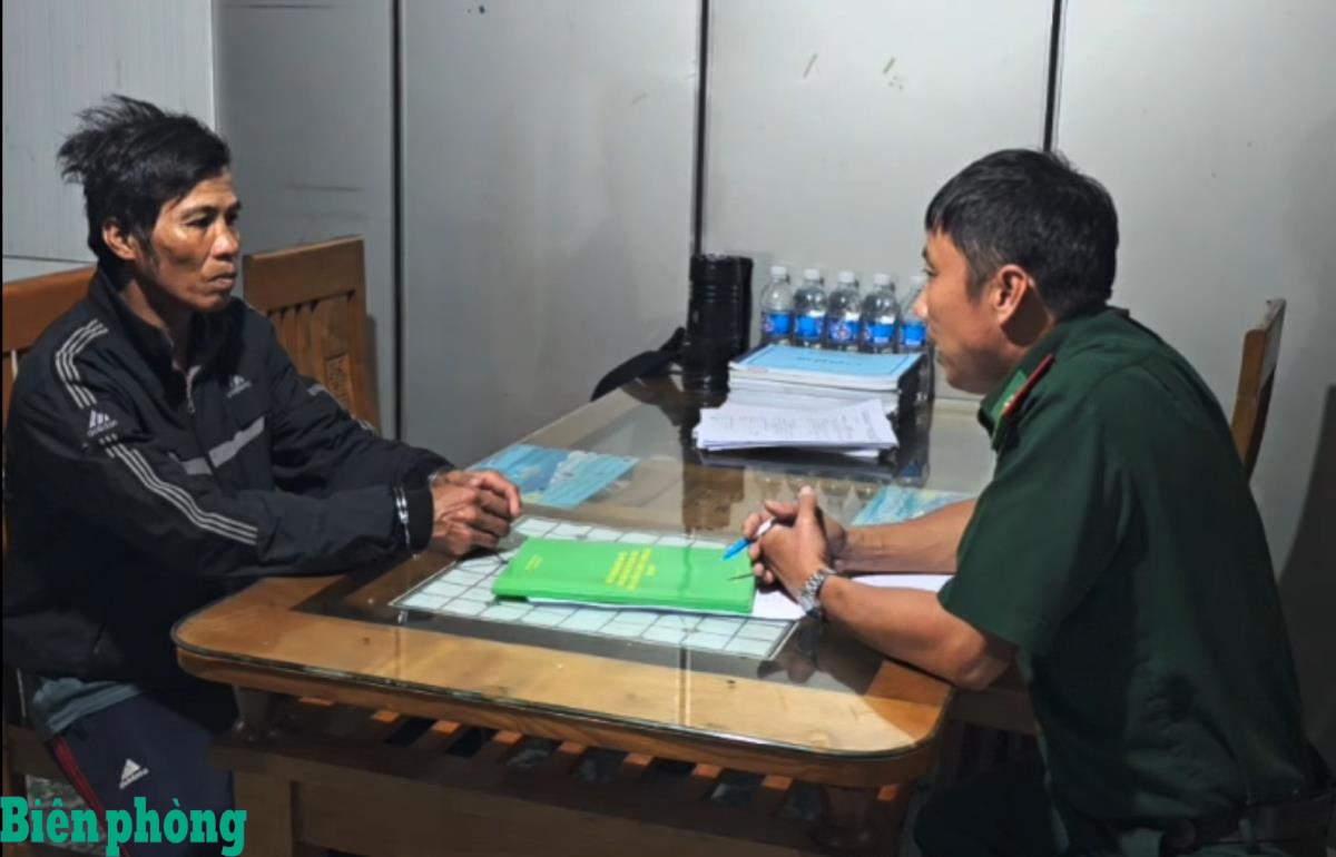 Cán bộ Đồn Biên phòng Bến Đá tiến hành lấy lời khai đối tượng Cao Trung Đông. Ảnh: Văn Danh
