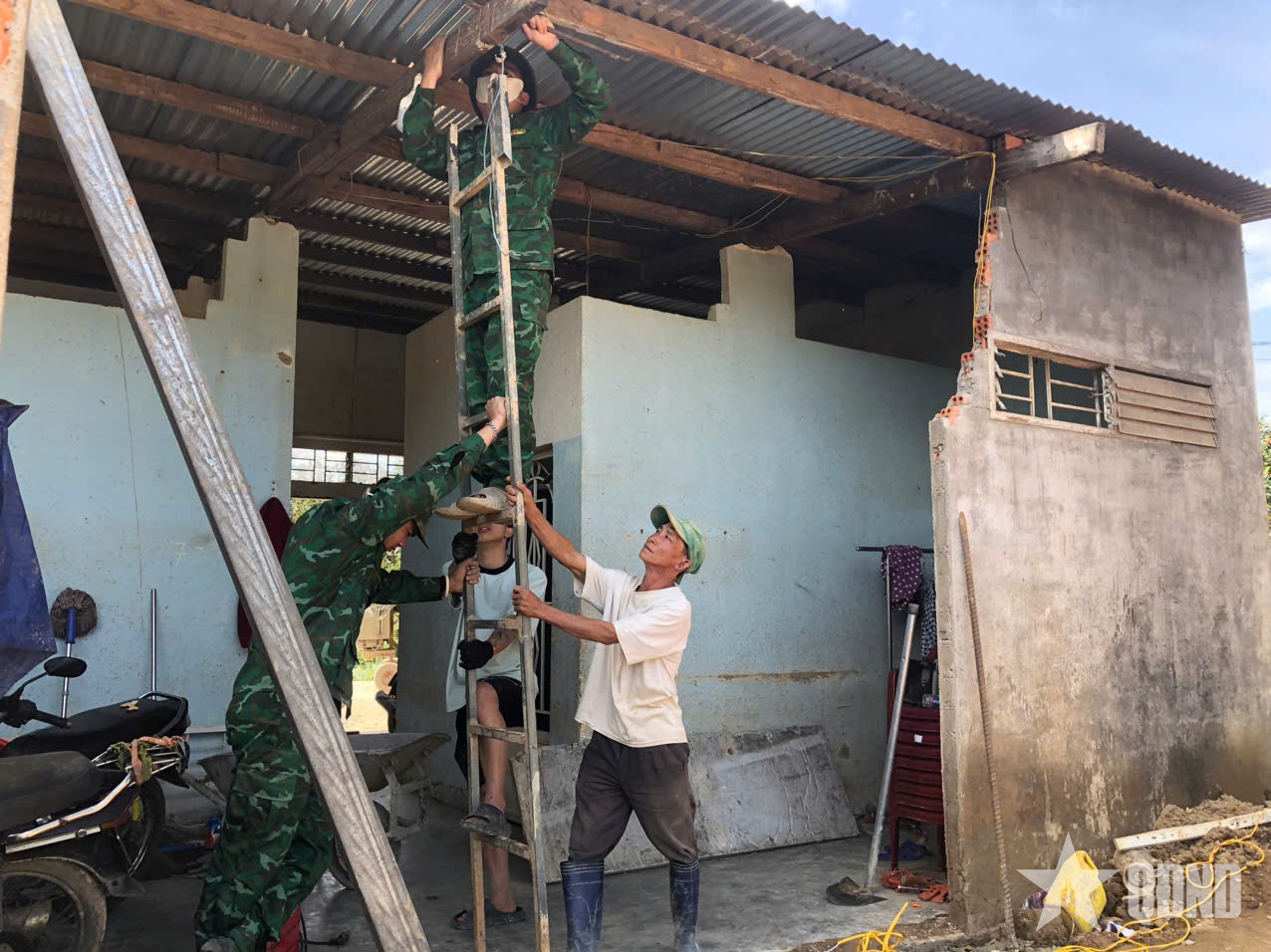 Cán bộ, chiến sĩ Đồn Biên phòng Cửa khẩu Thuận An giúp gia đình ông Y Thế làm mới toàn bộ phần mái nhà.