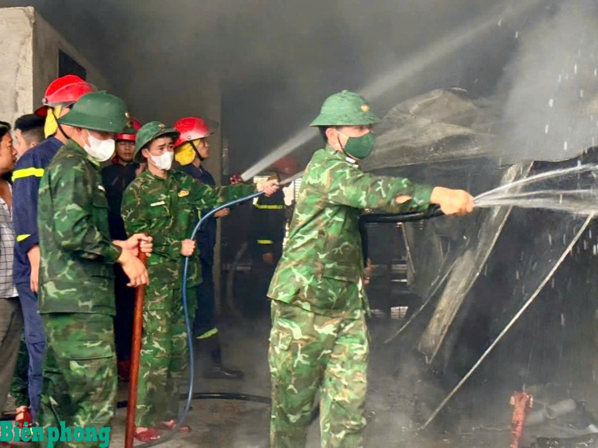Cán bộ, chiến sĩ Đồn Biên phòng Quỳnh Phương và các lực lượng tham gia chữa cháy cơ sở sản xuất của hộ gia đình trên địa bàn. Ảnh: Lê Thạch