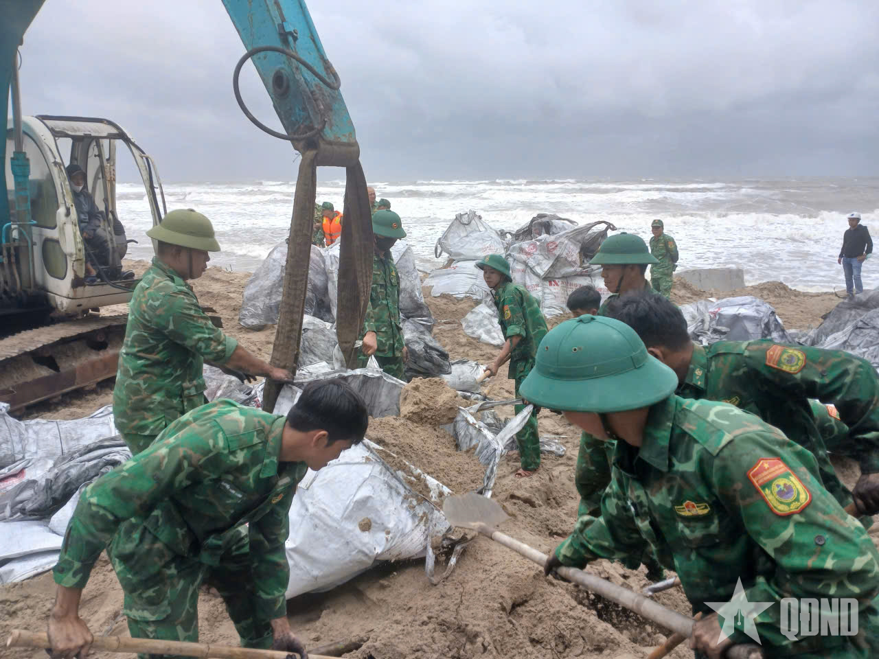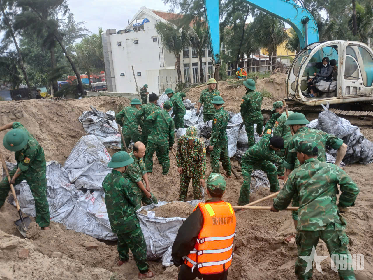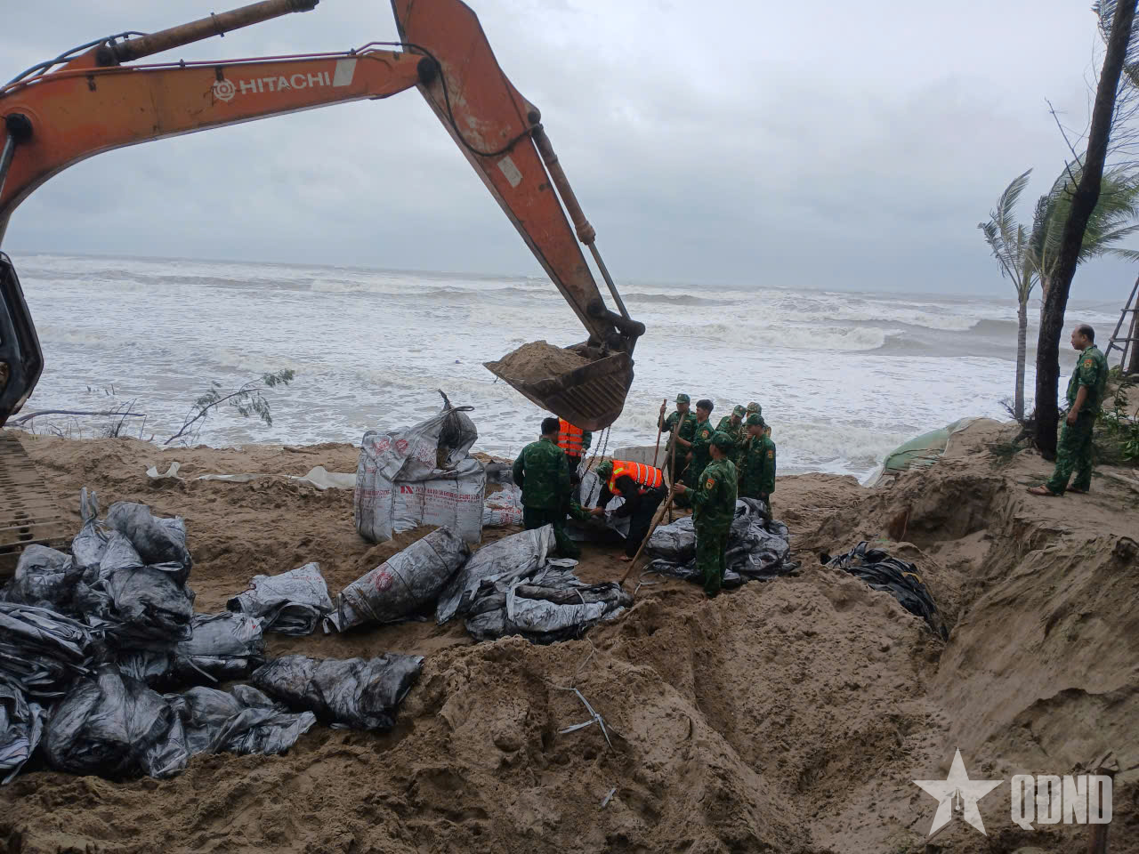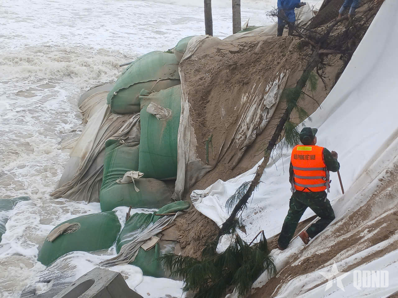 Bộ đội Biên phòng TP Đà Nẵng phối hợp với các lực lượng gia cố tạm thời kè chắn khu vực sạt lở.
