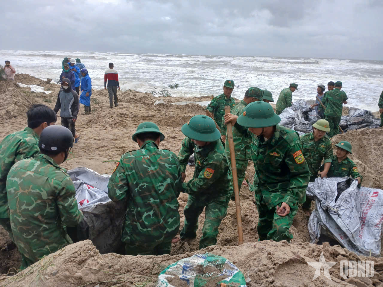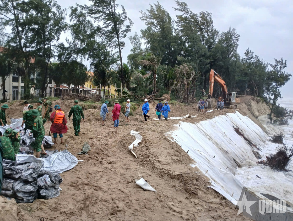 Các lực lượng đã sử dụng hai xe tải cẩu, hai máy đào công suất lớn để vận chuyển những khối bê tông đúc sẵn thả xuống vị trí xung yếu. Đồng thời sử dụng vải địa kỹ thuật để gia cố, lắp đặt tạm thời nhằm ngăn chặn tình trạng sóng biển xâm thực sâu vào nội địa.