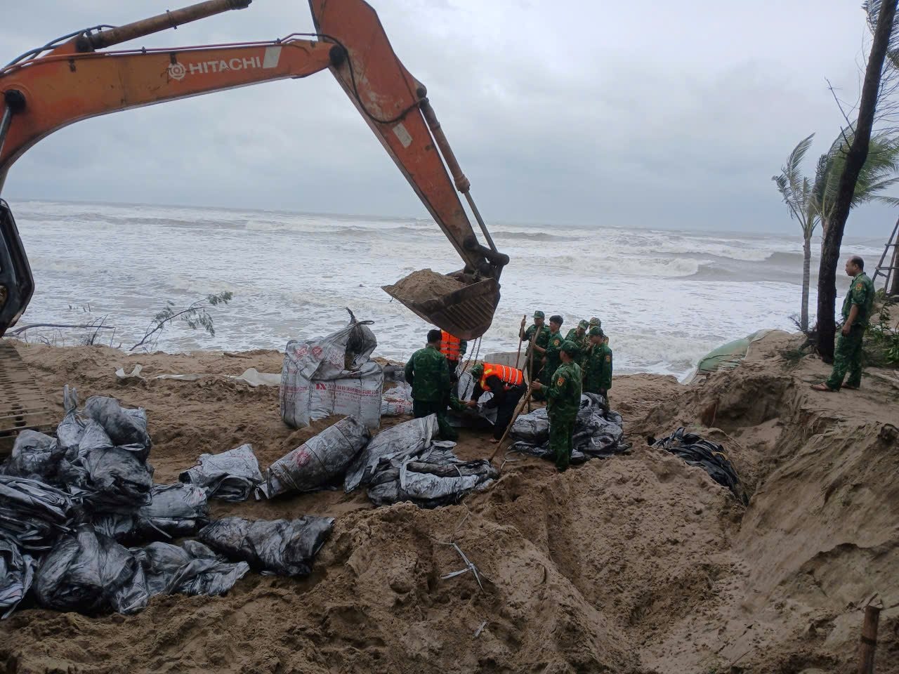 Hai xe tải cẩu, hai máy đào công suất lớn được huy động vận chuyển các khối bê tông đúc sẵn thả xuống vị trí xung yếu, kết hợp sử dụng vải địa kỹ thuật để gia cố, tạo lớp chắn tạm thời ngăn sóng tiếp tục xâm thực. Đến chiều cùng ngày, hơn 50m bờ biển có nguy cơ cao nhất đã được bảo vệ an toàn.
