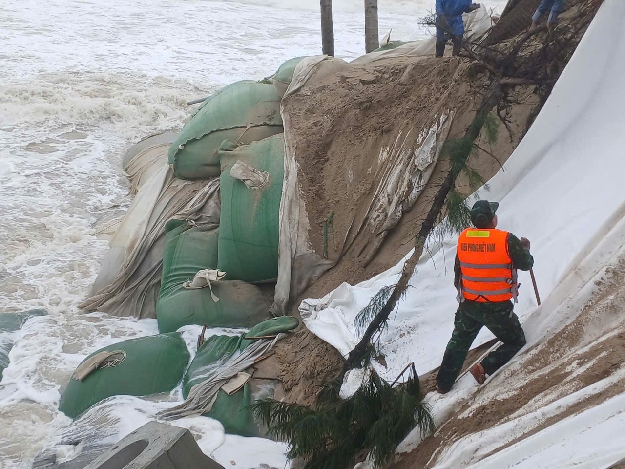 Cán bộ, chiến sĩ Bộ đội Biên phòng TP. Đà Nẵng gia cố tuyến kè tạm tại bờ biển An Bàng.