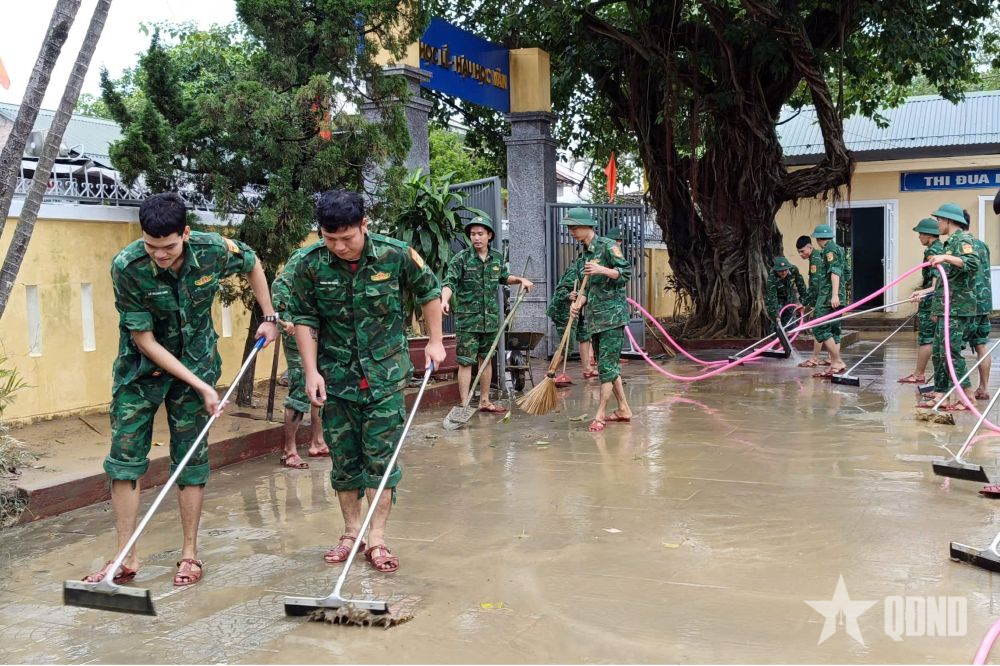 Cán bộ, chiến sĩ có mặt tại Trường Tiểu học Quang Trung và Trường Tiểu học Phú Lưu để giúp dọn dẹp bùn đất, tổng vệ sinh môi trường, sắp xếp lại bàn ghế, thiết bị dạy học, sẵn sàng cho học sinh trở lại trường trong thời gian sớm nhất.