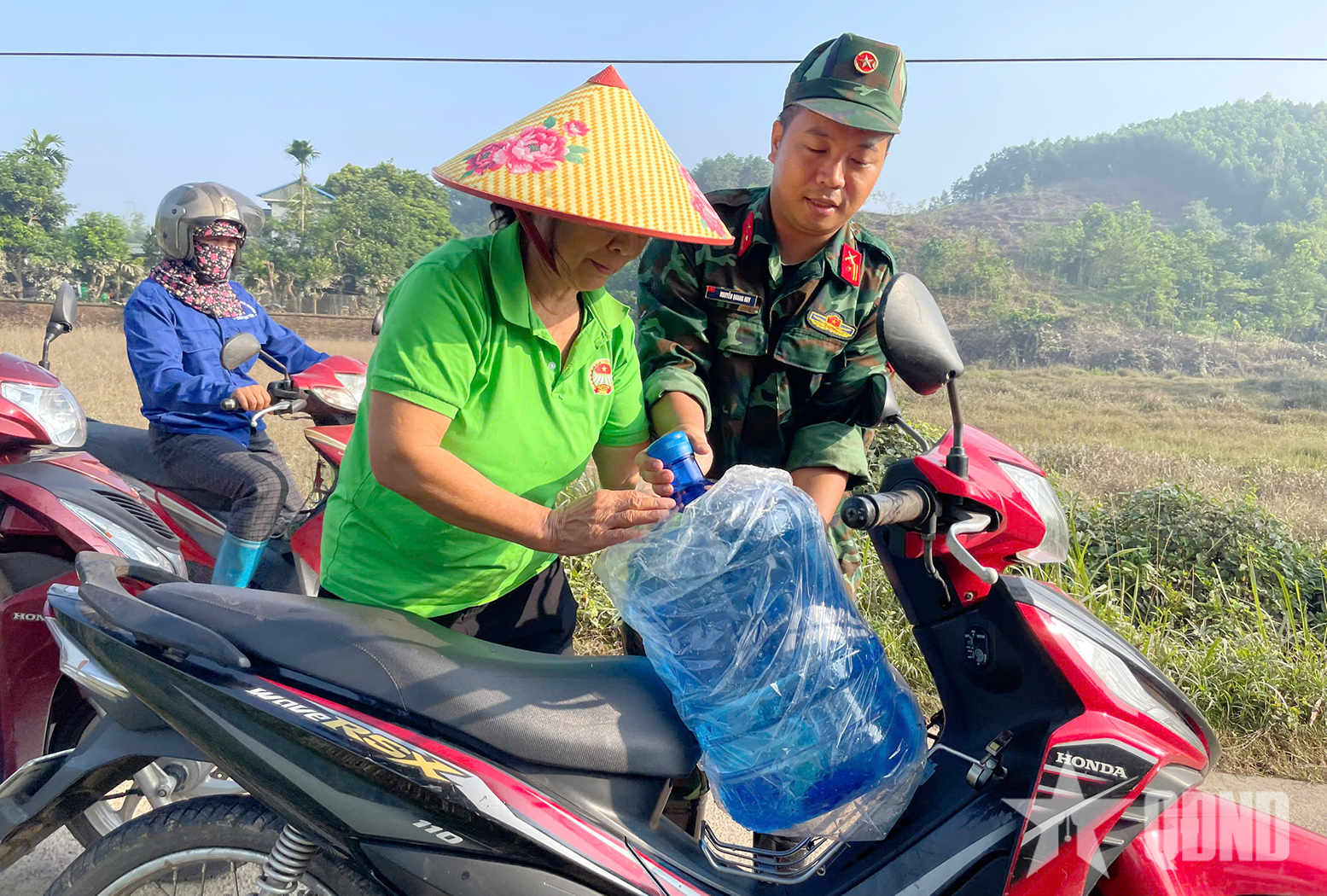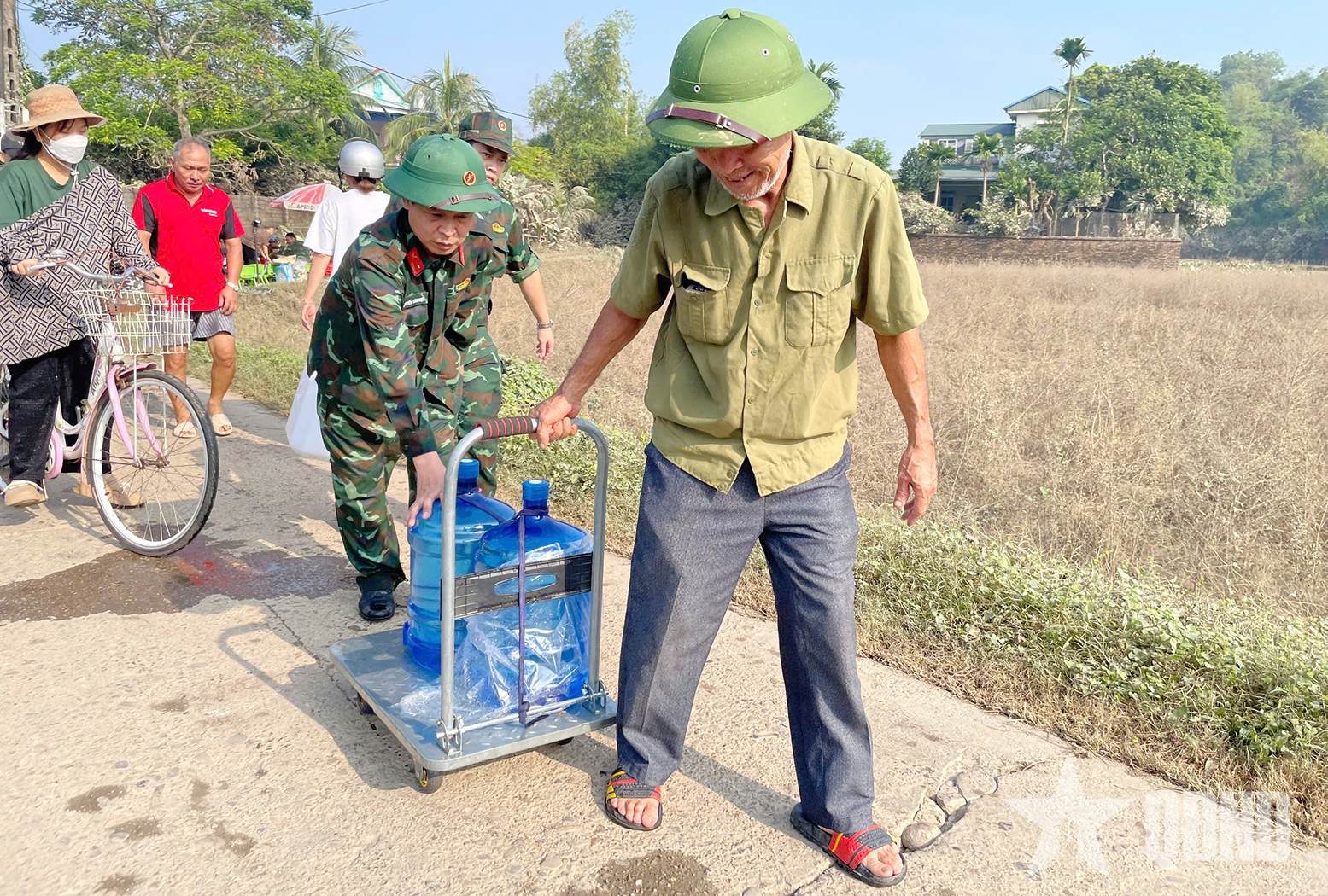Bộ đội nhiệt tình hỗ trợ bà con vận chuyển nước.