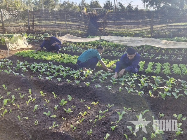 Bộ đội Đội K51 chăm sóc vườn rau xanh.
