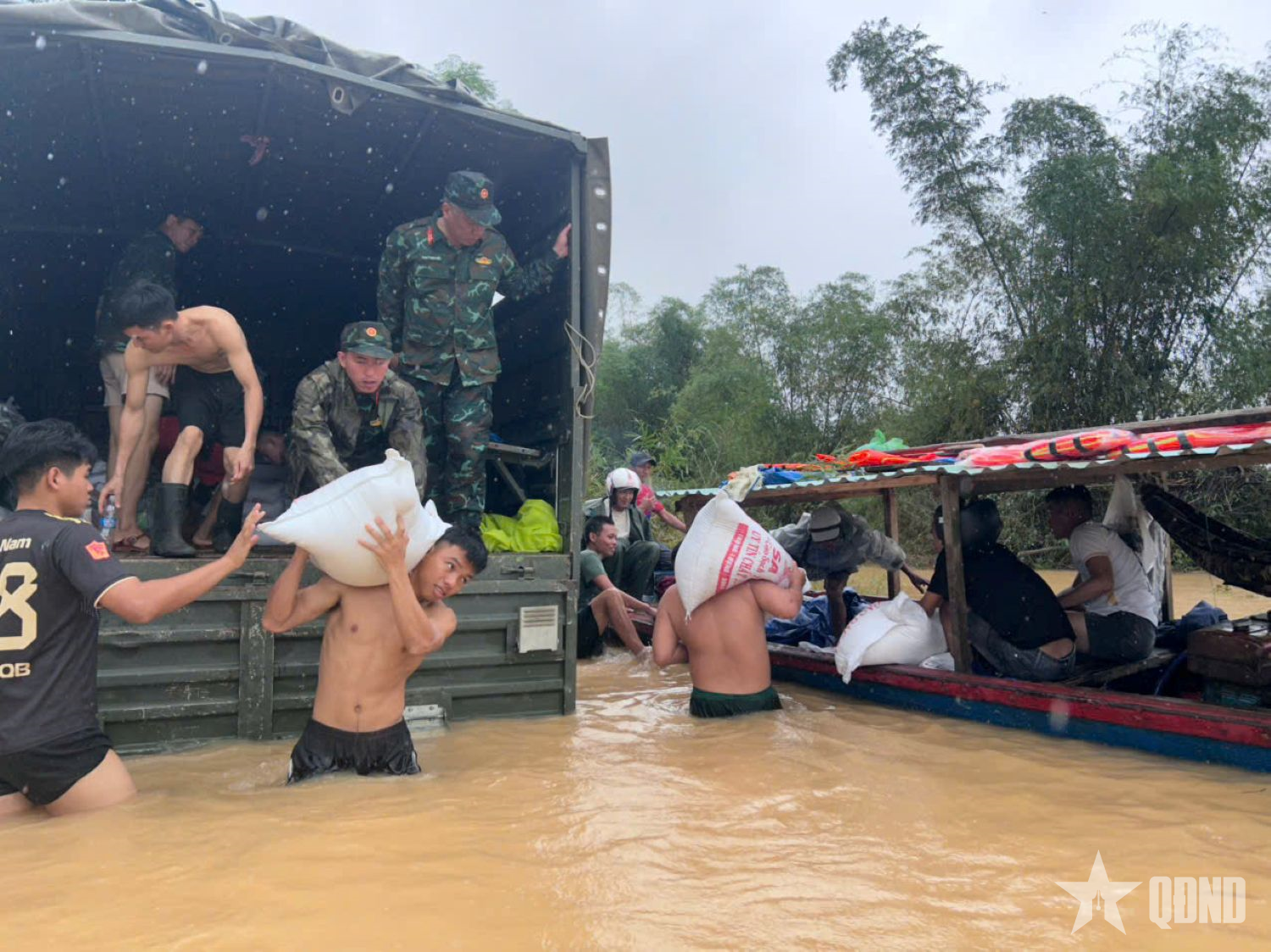 Tuy thời tiết tiếp tục diễn biến phức tạp, nhiều đoạn đường nước dâng cao, không quản ngại hiểm nguy, bộ đội đã vượt qua những đoạn đường sạt lở, băng qua đoạn ngập sâu để vận chuyển từng bao gạo, từng thùng quà, trao gửi đến từng nhà.