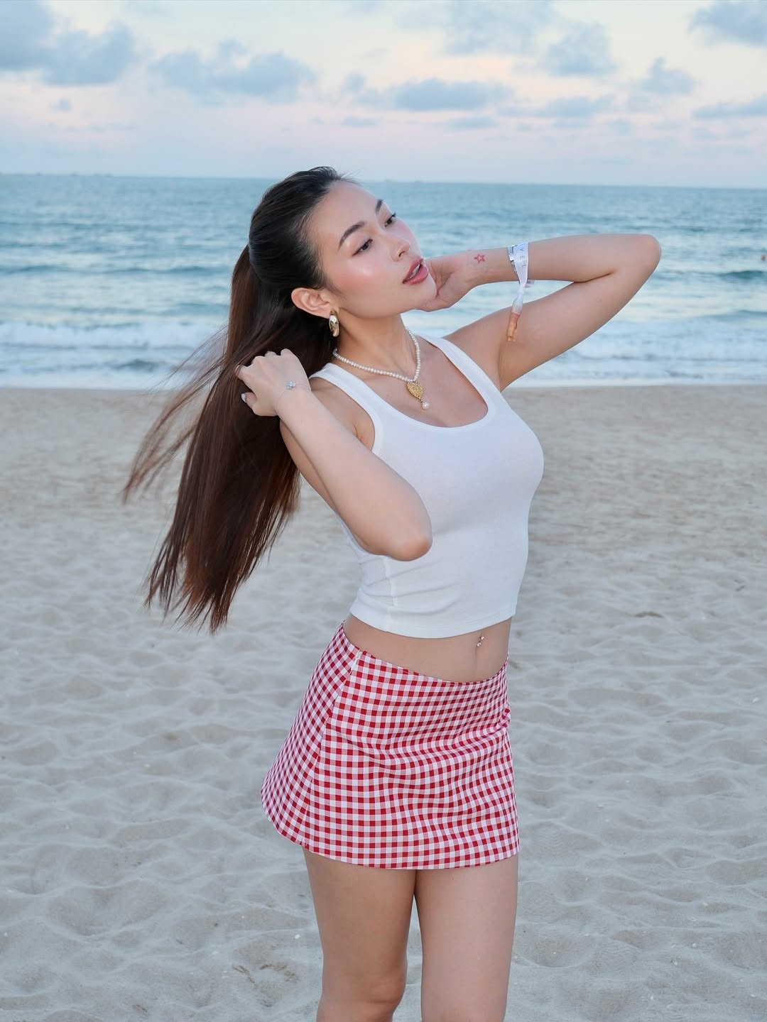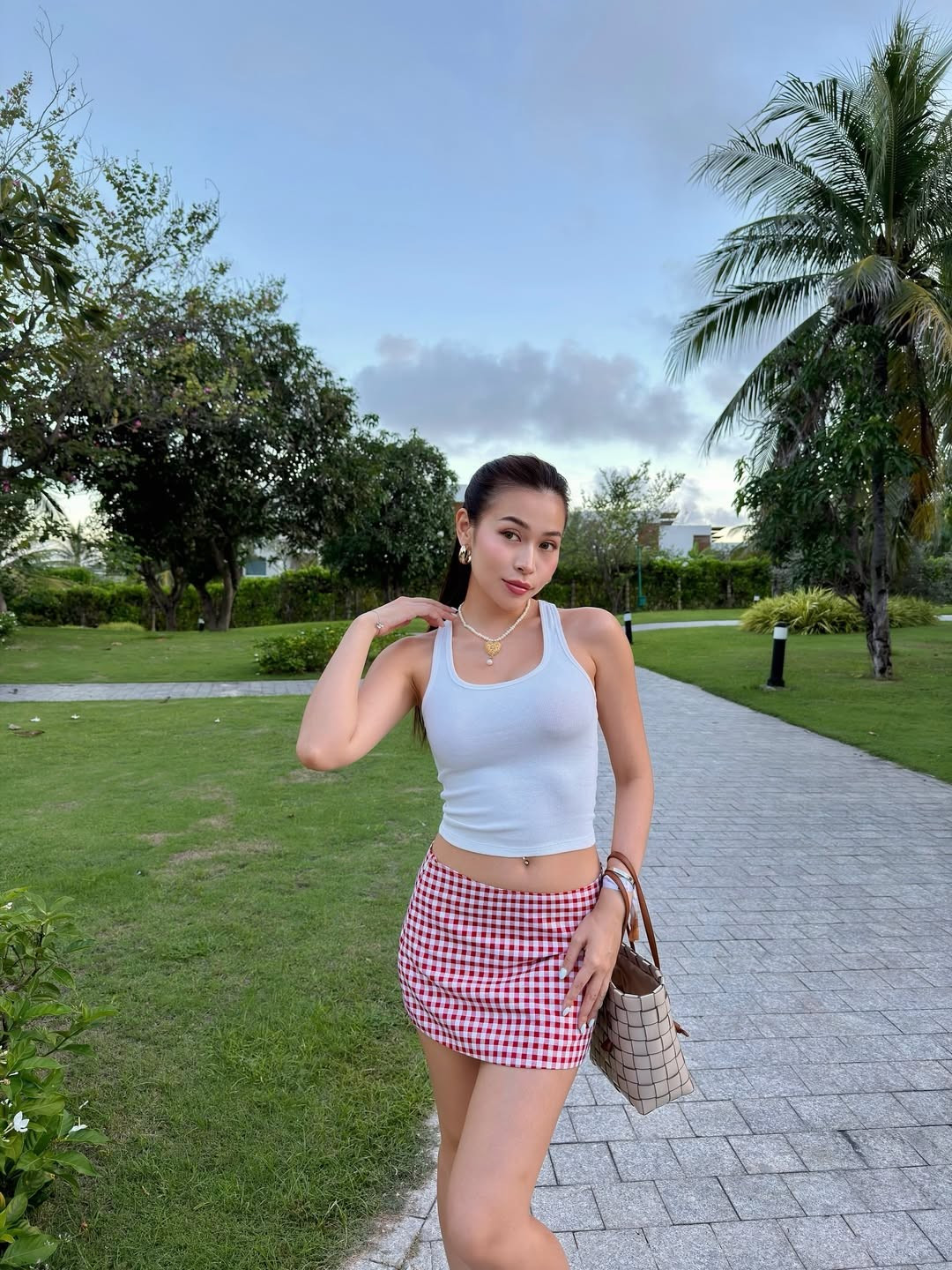Điểm nhấn chính là chiếc chân váy mini kẻ ô Gingham tông màu đỏ và trắng. Họa tiết kẻ ô này mang hơi hướng cổ điển, gợi nhớ đến phong cách thời trang thập niên 50-60. Chân váy ngắn giúp tôn lên đôi chân dài và tạo vẻ ngoài trẻ trung, tinh nghịch.