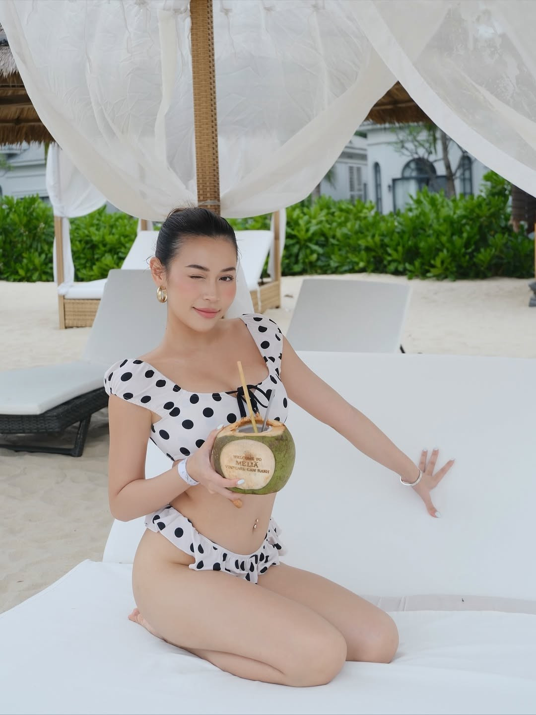 Trong khi đó, Nguyên Newin đã chọn một set đồ bơi với họa tiết chấm bi đen trắng kinh điển, mang đến sự kết hợp hoàn hảo giữa nét cổ điển và hiện đại.
