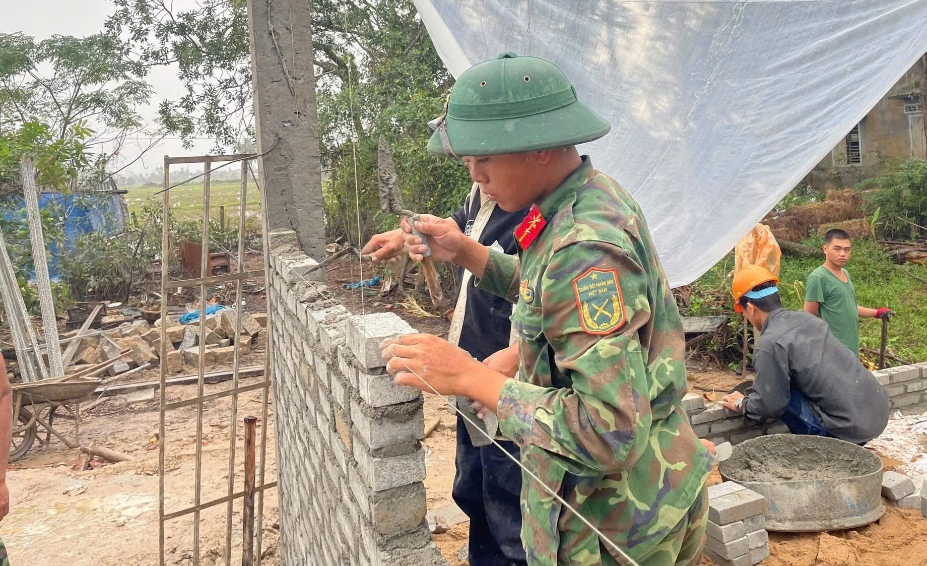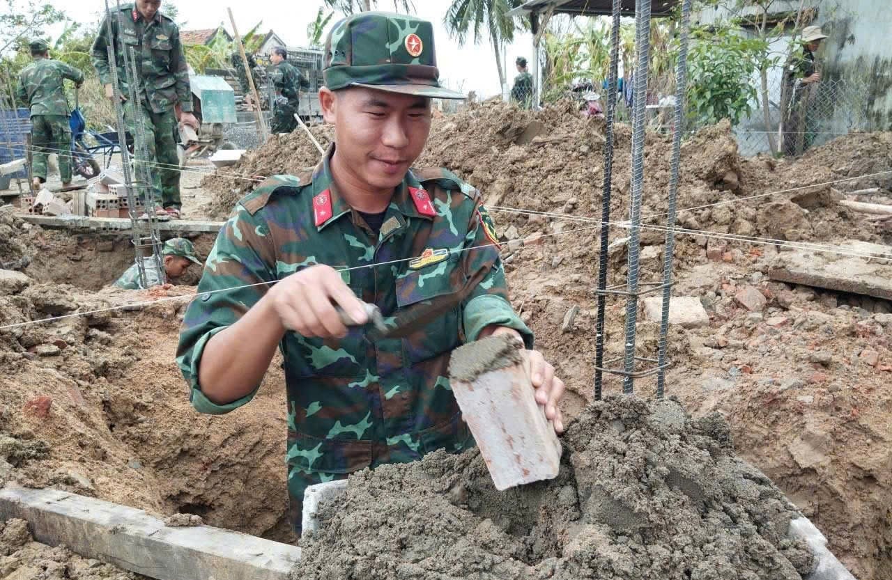 Cán bộ, chiến sĩ Sư đoàn 315 xây dựng lại nhà ở cho nhân dân trên địa bàn xã Hòa Thịnh, tỉnh Đắk Lắk chiều 10-12. Ảnh: TH315