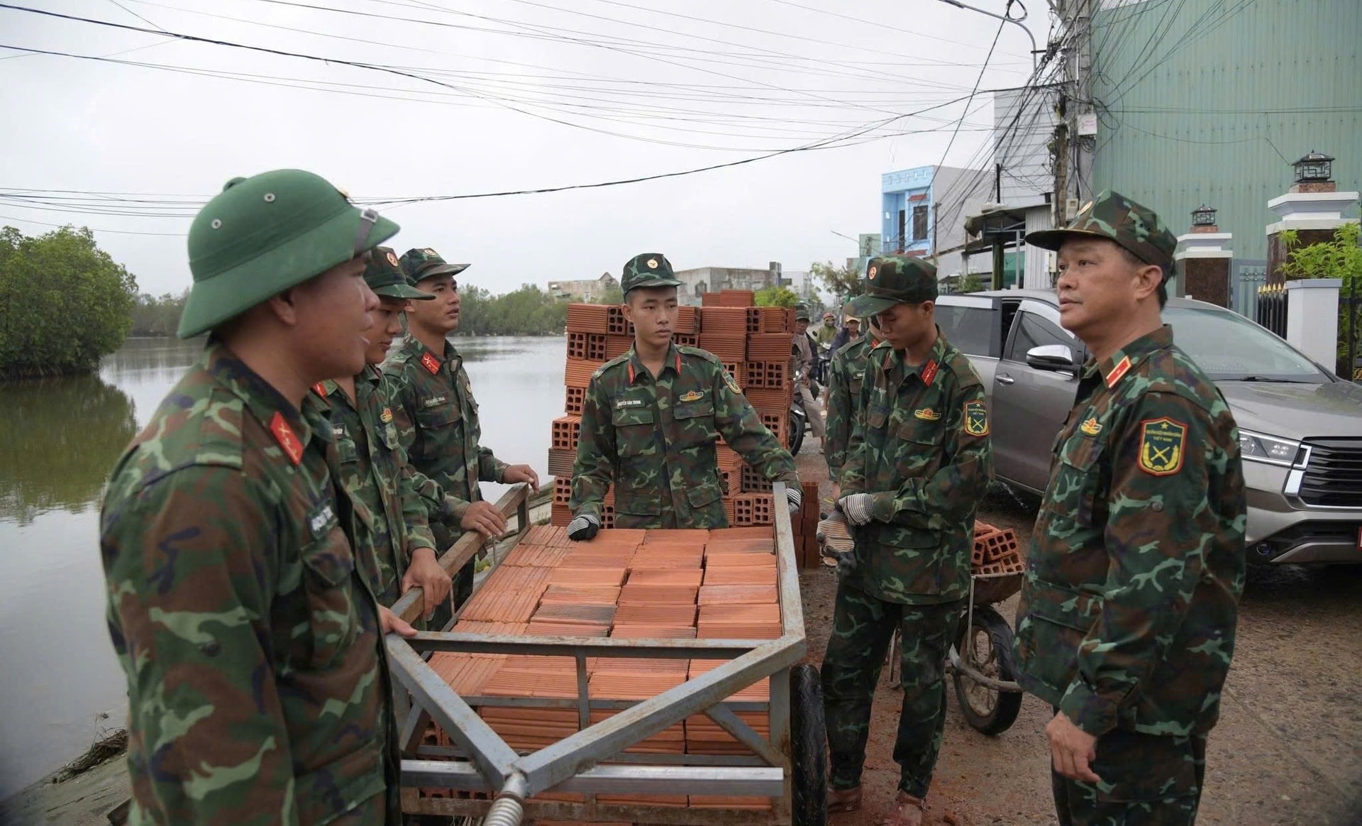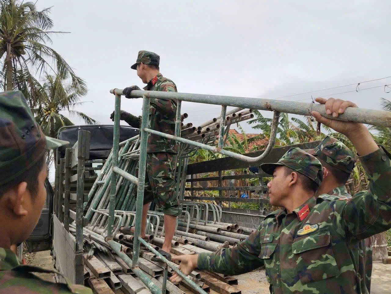 Cán bộ, chiến sĩ Bộ Chỉ huy Quân sự tỉnh Khánh Hòa, Vùng 4 Hải quân và Lữ đoàn Đặc công nước 5 miệt mài giúp dân dựng lại từng mái nhà đã trở thành điểm tựa tinh thần vững chắc cho người dân vùng thiên tai. Ảnh: Văn Cốc.