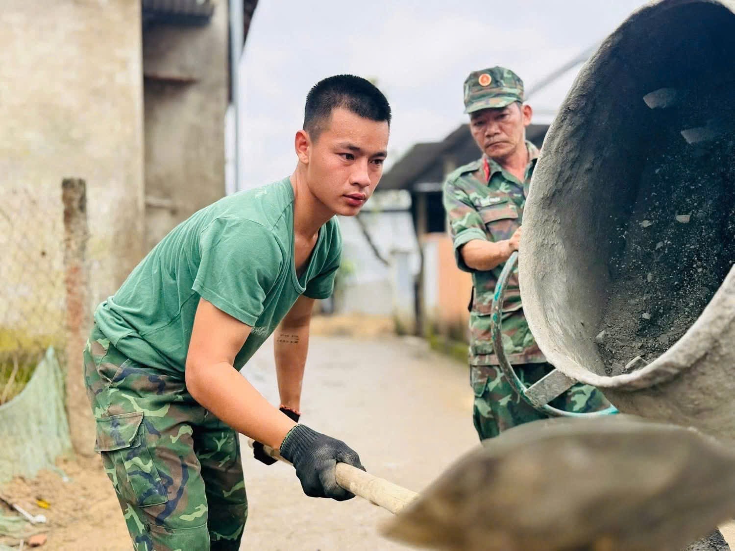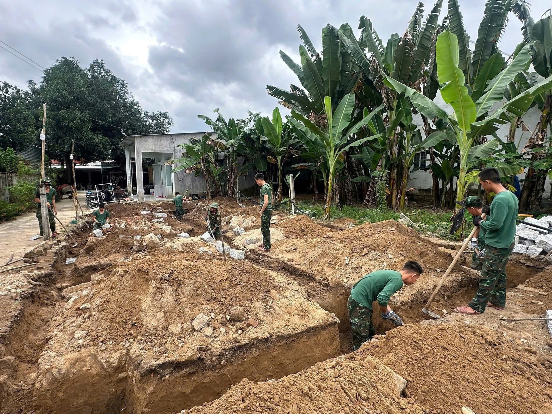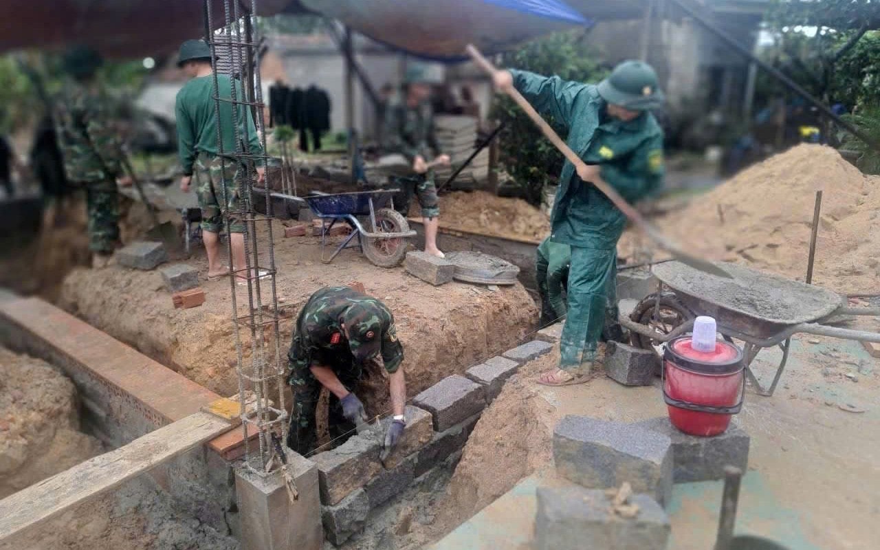 Cũng tại xã Hòa Thịnh, nơi chịu ảnh hưởng nặng nề trong đợt mưa lũ vừa qua, cán bộ, chiến sĩ Lữ đoàn 574 đang khẩn trương đẩy nhanh tiến độ xây dựng trên những khu vực trước đó chỉ là đống đổ nát. Ảnh: Nam Phong