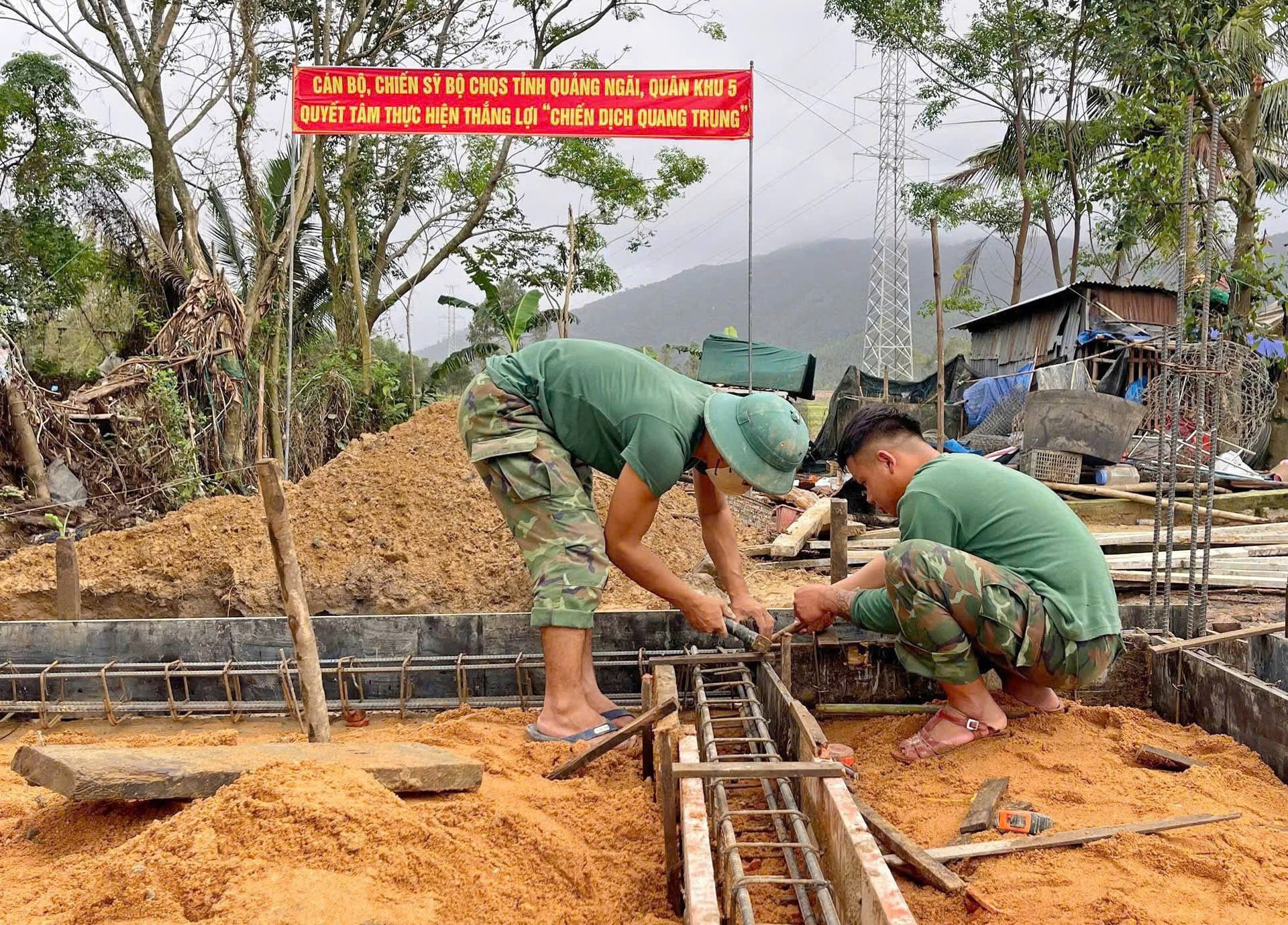 Thực hiện "Chiến dịch Quang Trung" thần tốc xây nhà cho dân vùng lũ, những ngày qua, tại phường Đông Hòa (tỉnh Đắk Lắk), cán bộ, chiến sĩ lực lượng vũ trang Quảng Ngãi đã làm ngày, làm đêm, vượt mọi điều kiện khó khăn về thời tiết để giúp nhân dân sớm dựng lên những ngôi nhà mới ổn định cuộc sống. Ảnh: V.Minh