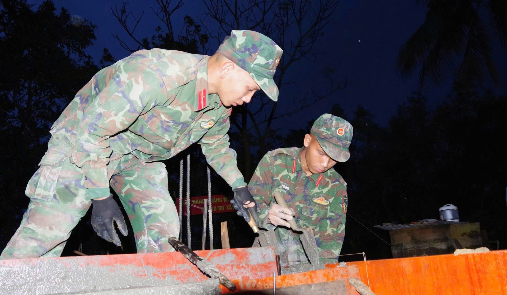 19h ngày 10-12, cán bộ, chiến sĩ Trung đoàn BB584, Bộ CHQS tỉnh Đắk Lắk đang khẩn trương chạy đua từng giờ, từng phút để hoàn thành các hạng mục. Với phương châm hoàn thành sớm ngày nào, bà con vùng lũ đỡ vất vả ngày đó, các cơ quan, đơn vị đã tổ chức 3 đến 4 kíp luân phiên làm việc liên tục từ sáng sớm đến tối muộn, tăng cường làm ca đêm, nhằm rút ngắn tối đa thời gian bàn giao nhà sớm nhất cho bà con. Ảnh: Tiến Lượng