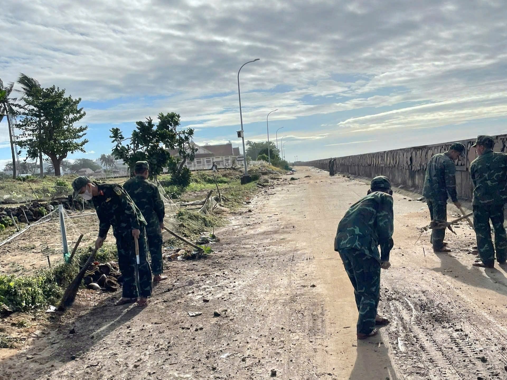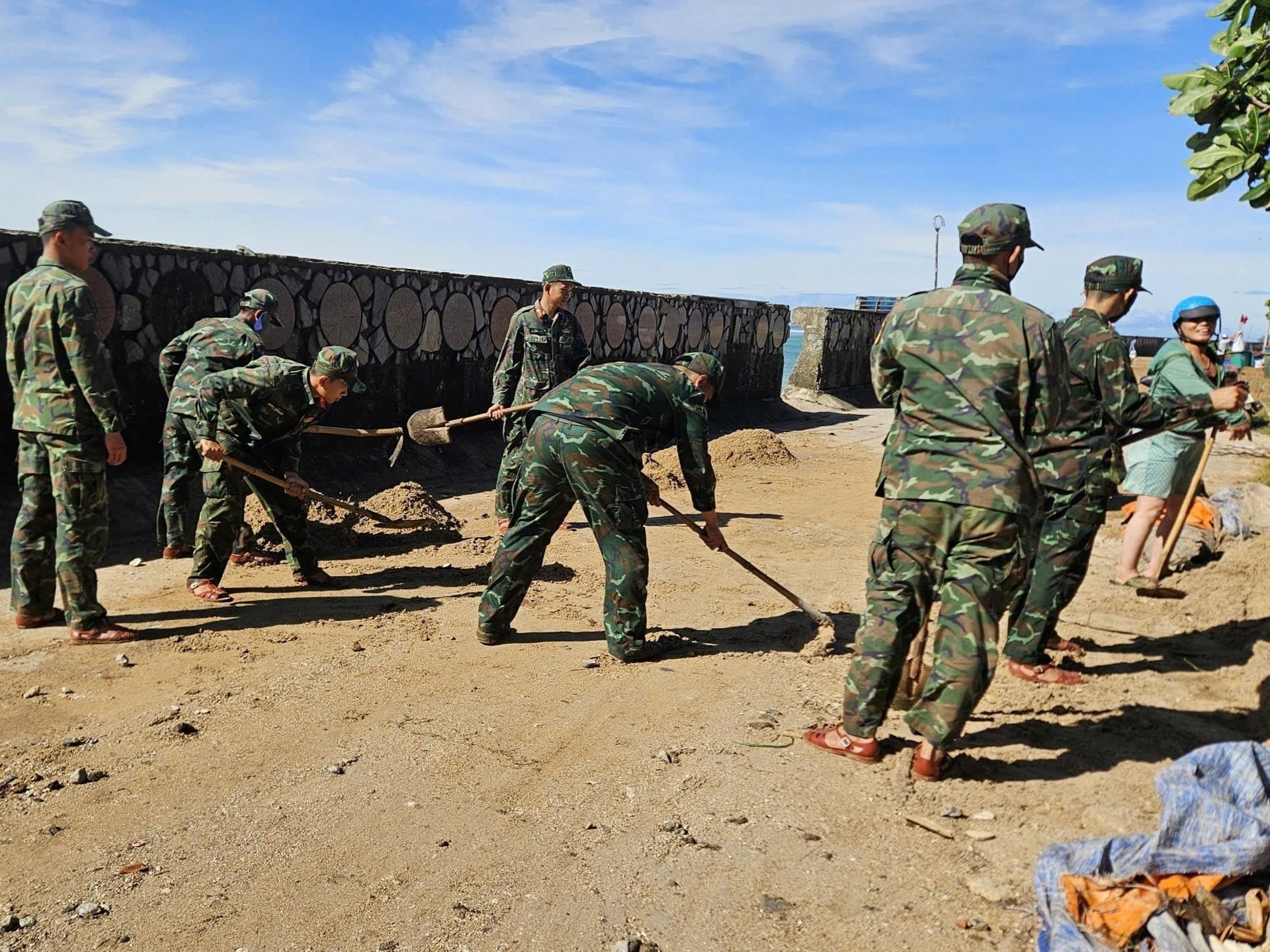 Bộ đội địa phương san gạt đất, dọn vệ sinh khu vực ven biển sau mưa bão.