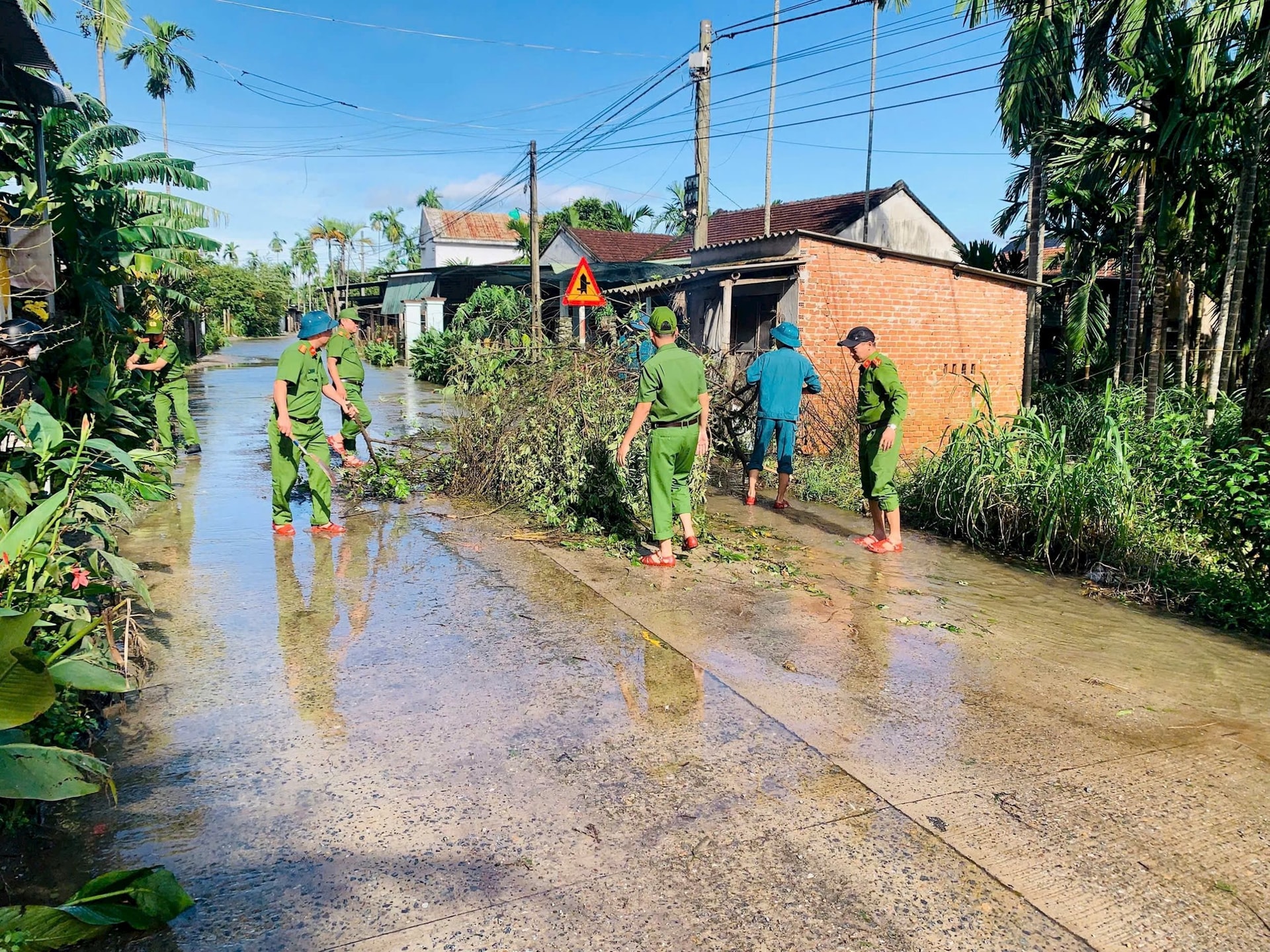 Lực lượng công an và dân quân xã thu dọn cây cối ngã đổ, khơi thông tuyến đường.