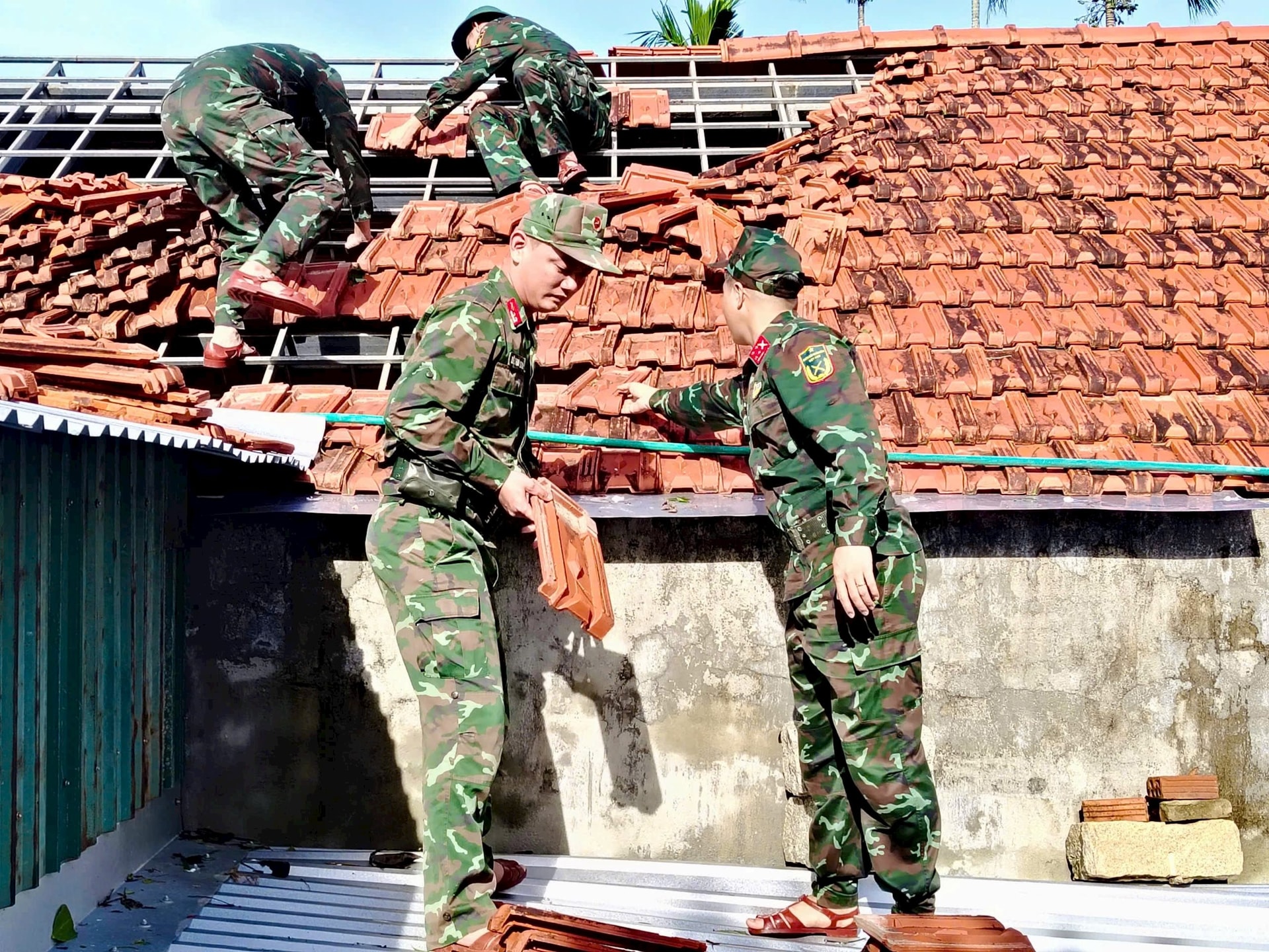 Cán bộ, chiến sĩ Bộ CHQS tỉnh Quảng Ngãi hỗ trợ người dân lợp lại mái ngói nhà bị hư hỏng sau bão.