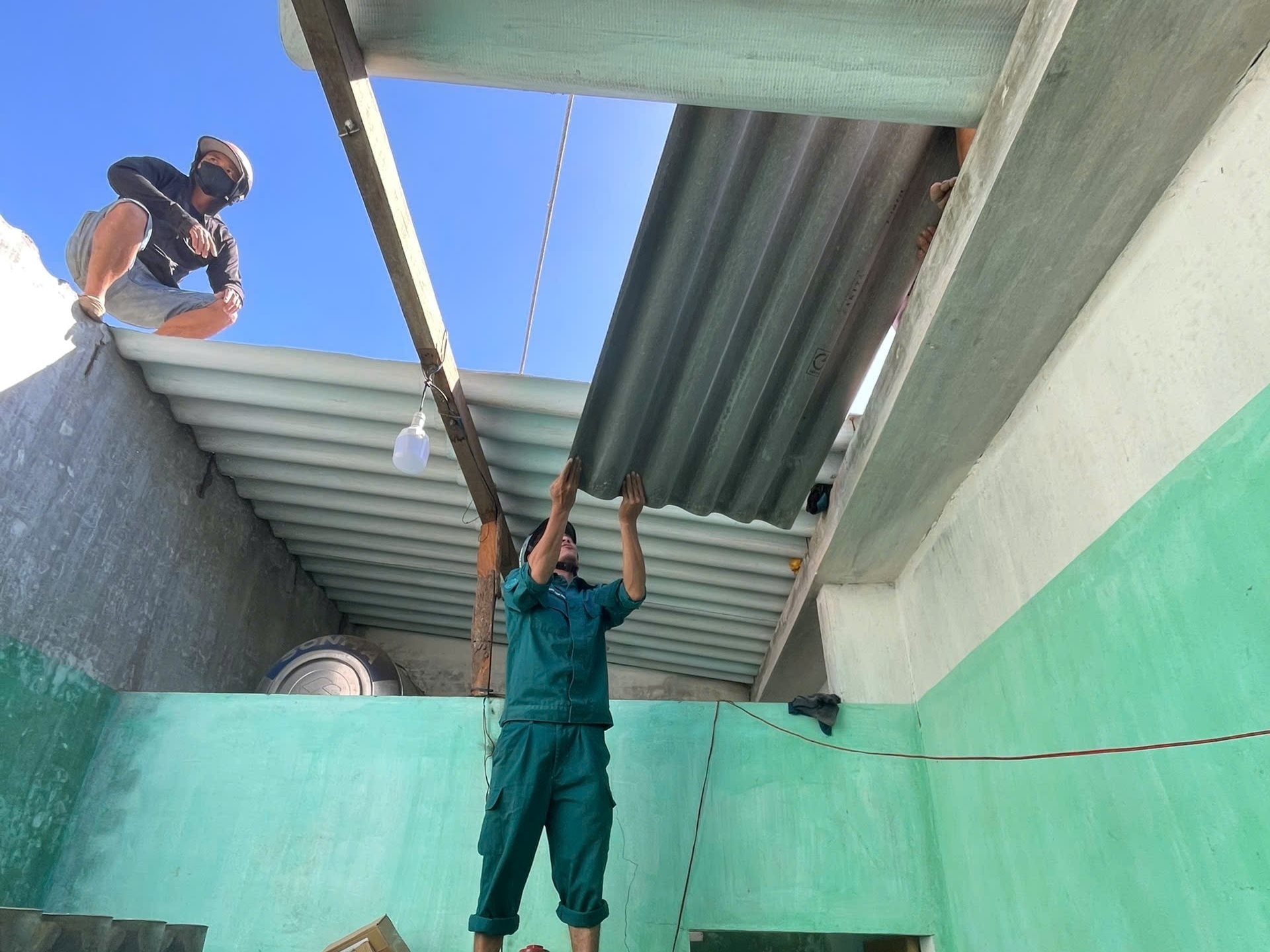Dân quân địa phương giúp người dân lợp lại mái tôn bị tốc, sớm ổn định chỗ ở.