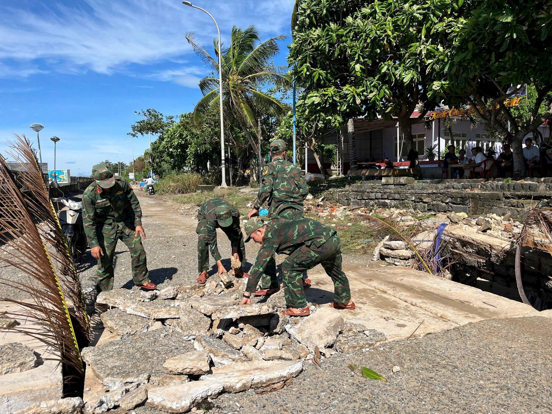 Cán bộ, chiến sĩ Bộ CHQS tỉnh Quảng Ngãi thu dọn bê tông, khắc phục đoạn đường bị sạt lở sau bão.