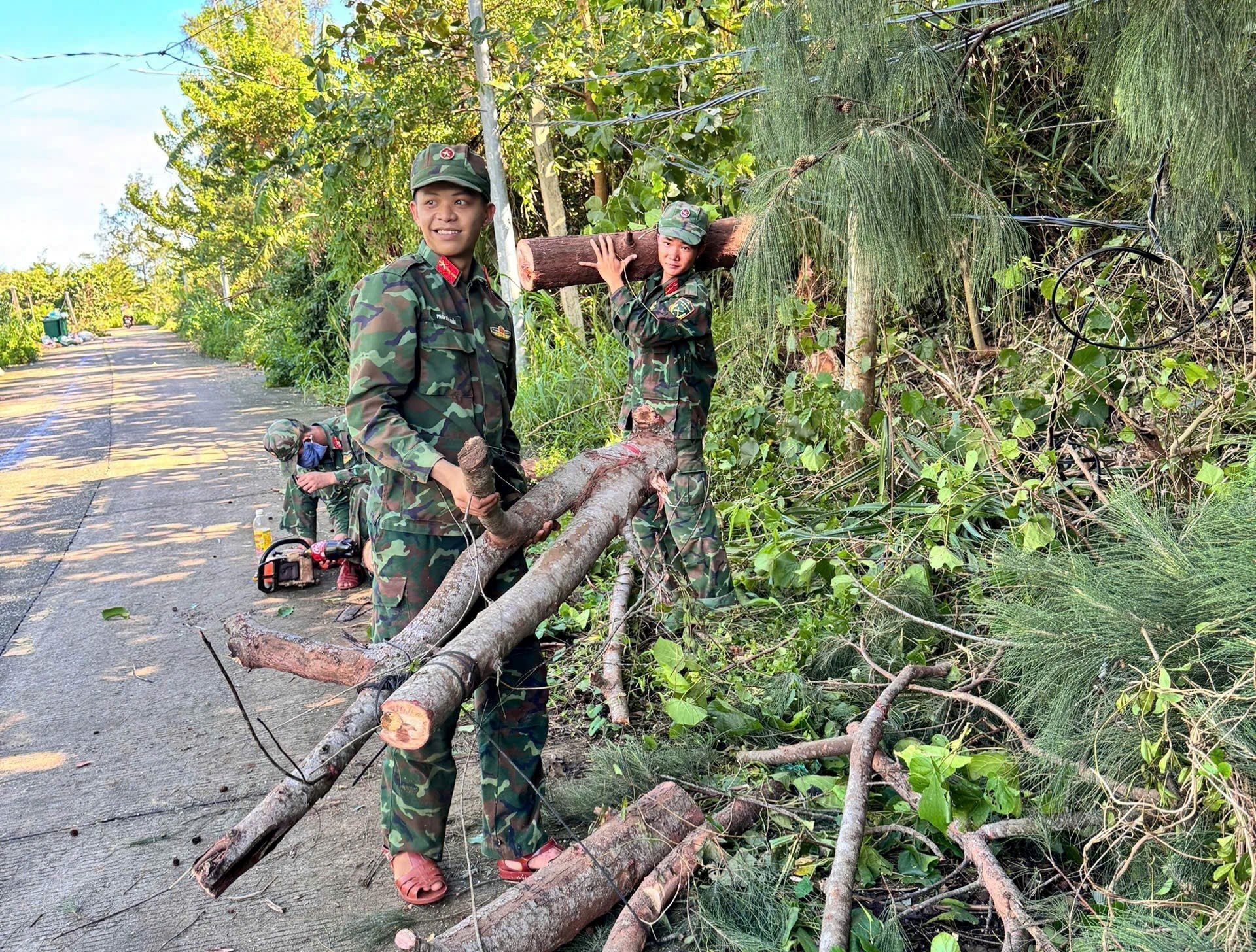 Lực lượng bộ đội cắt dọn cây ngã đổ, đảm bảo an toàn giao thông trên các tuyến đường.