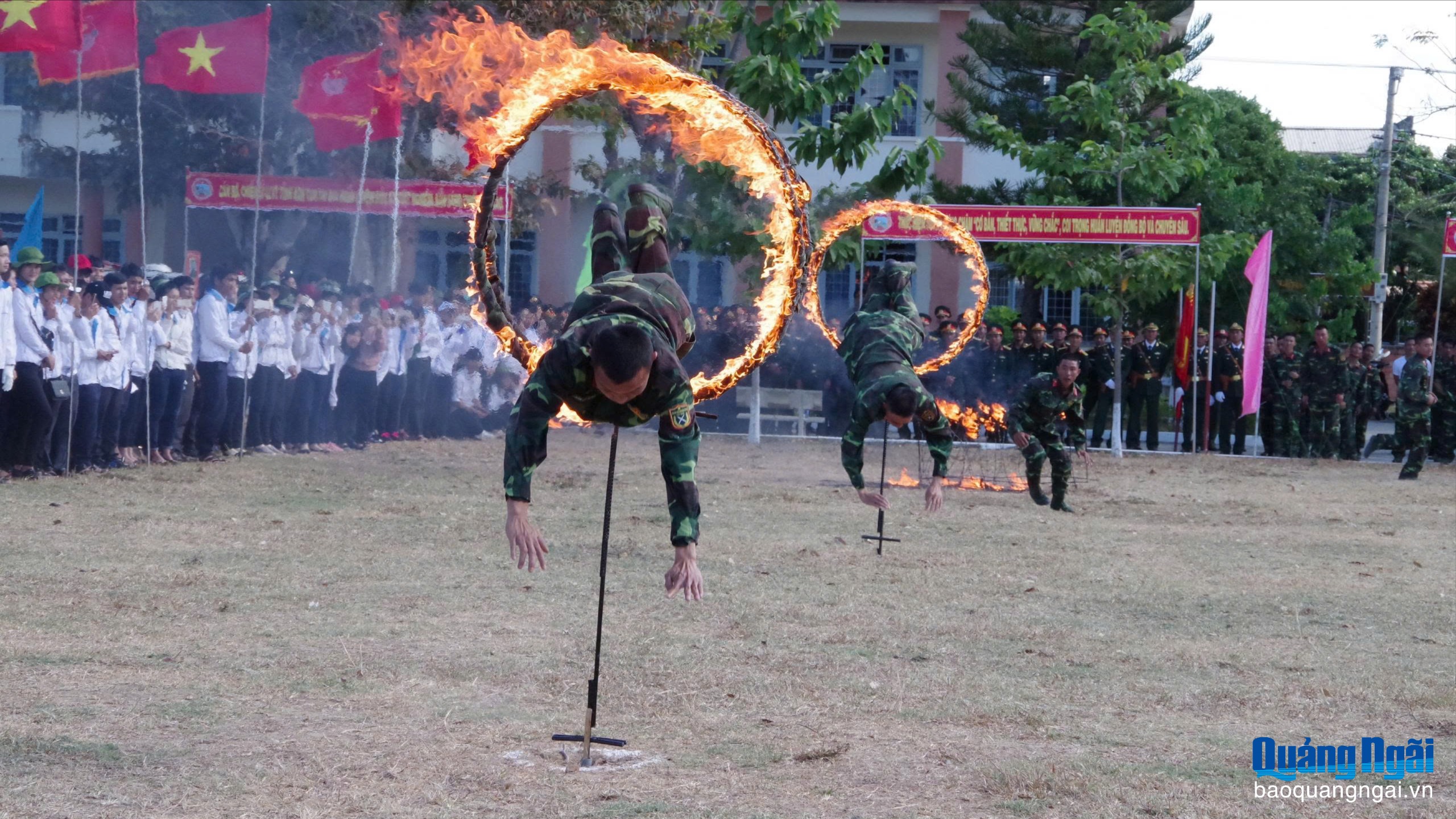 Cán bộ, chiến sĩ Đại đội Trinh sát - Cơ giới 2 luyện tập kỹ năng nhào lộn qua vòng lửa. ẢNH:TRỌNG QUỐC