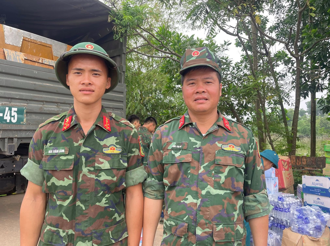 Thiếu tá Tống Văn Hà (bên phải) và Thượng sĩ Bùi Văn Lâm tham gia cứu hộ, giúp dân di chuyển, bảo vệ tài sản và khắc phục hậu quả mưa lũ. Ảnh: NGỌC HUÂN