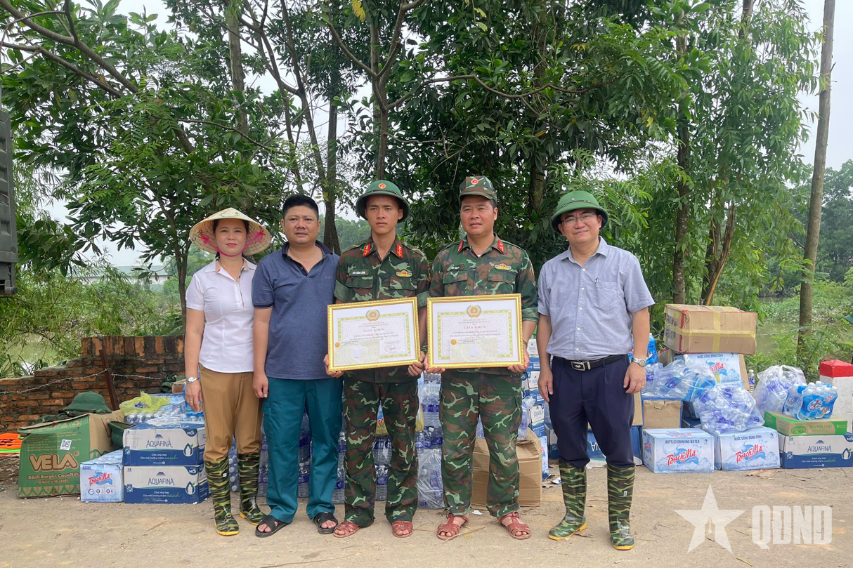 Đồng chí Lê Hữu Mạnh, Bí thư Đảng ủy xã Trung Giã (Hà Nội) (ngoài cùng bên phải) trao Giấy khen đột xuất của UBND xã Trung Giã tặng Thiếu tá Tống Văn Hà, Thượng sĩ Bùi Văn Lâm dũng cảm cứu người. Ảnh: NGỌC HUÂN