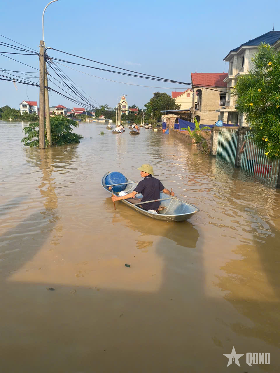 Người dân phải di chuyển bằng thuyền do nước lũ tràn về.