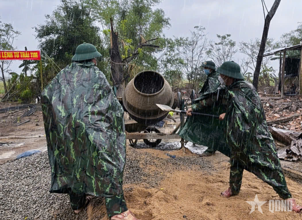 Tại công trình xây nhà mới giúp hộ ông Lê Tấn Cẩm, ở thôn Phú Diễn Trong, xã Hòa Thịnh, những “anh thợ xây áo lính” vẫn đang tất bật với công việc xây dựng, nhưng trên khuôn mặt của những chàng lính trẻ vẫn ánh lên niềm vui tại nơi công trường. Ngôi nhà cũ của ông Cẩm đã đổ nát hoàn toàn sau trận lũ vừa qua, từng viên gạch được bộ đội sắp xếp gọn lại 1 chỗ, các mảng tường đổ vỡ cũng được dọn dẹp gọn gàng để lấy chỗ san phẳng mặt bằng và tiến hành đổ móng. Từ việc dọn dẹp, góp nhặt lại những đồ dùng còn sử dụng được, đến đào móng, trộn bê tông, tất cả đều được được thực hiện bởi bàn tay của những người lính trẻ.