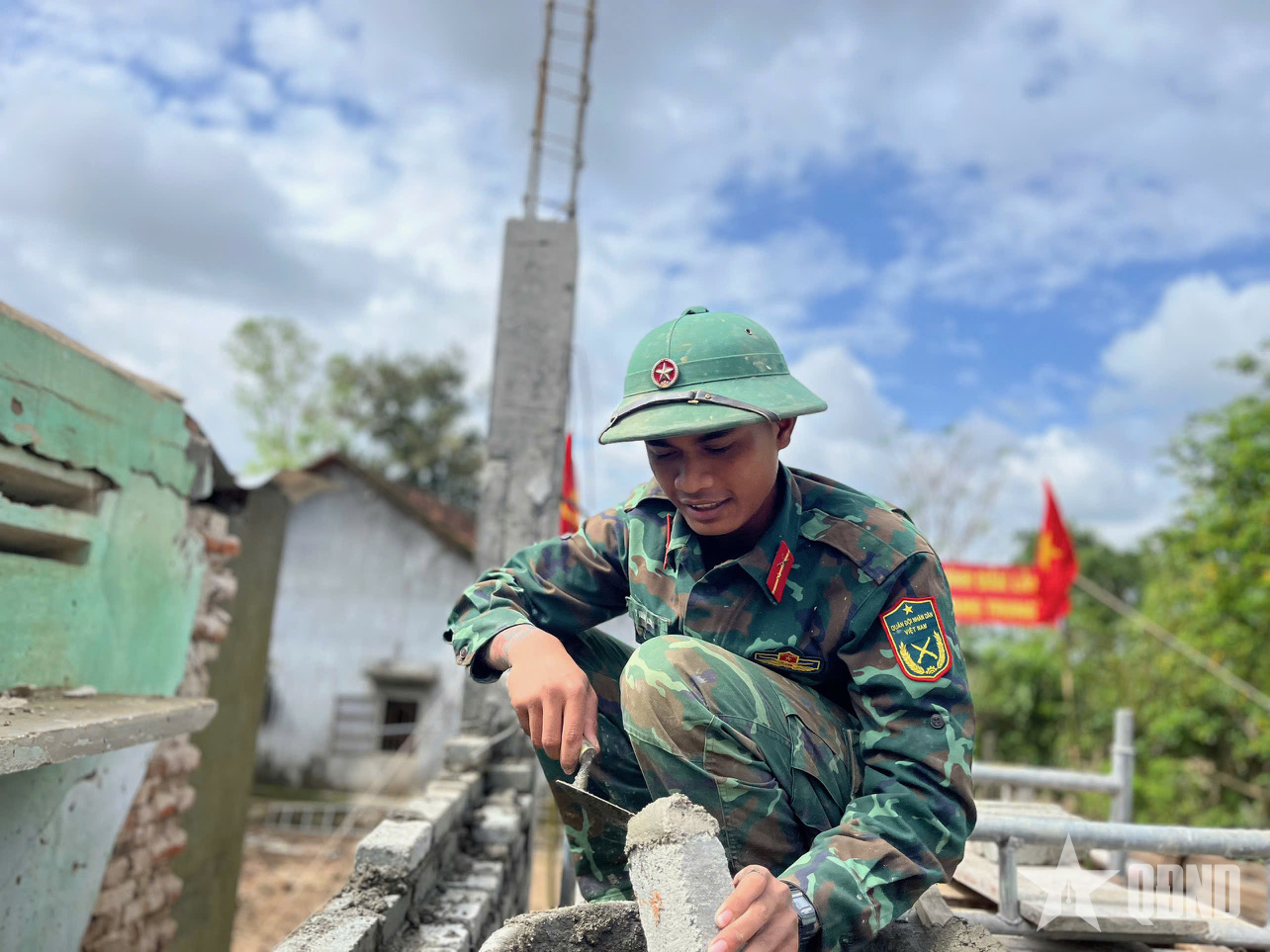 Cũng tại xã Hòa Thịnh, trên công trình xây nhà giúp hộ ông Lê Văn Phải, thôn Phú Mỹ, cùng với cán bộ, chiến sĩ bộ đội thường trực của các đơn vị, các “chiến sĩ sao vuông” trên địa bàn tỉnh Đắk Lắk cũng đang tích cực tham gia thực hiện nhiệm vụ. Lực lượng dân quân đã sát cánh cùng bộ đội từ những ngày đầu, các phần việc nặng nhọc nhất như vận chuyển vật liệu, đào móng, đổ bê tông đến hỗ trợ bà con dọn dẹp, thu dọn mặt bằng. Dù vất vả, khó khăn là vậy song các chiến sĩ dân quân vẫn luôn nêu cao tinh thần trách nhiệm, chủ động phối hợp chặt chẽ với bộ đội thường trực, góp phần tạo nên sức mạnh tổng hợp, đẩy nhanh tiến độ thi công, để mỗi căn nhà đều được bàn giao tới bà con sớm nhất có thể và có chất lượng tốt nhất.