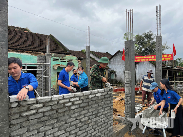 Đoàn viên, thanh niên xã Hòa Thịnh cùng bộ đội xây nhà.