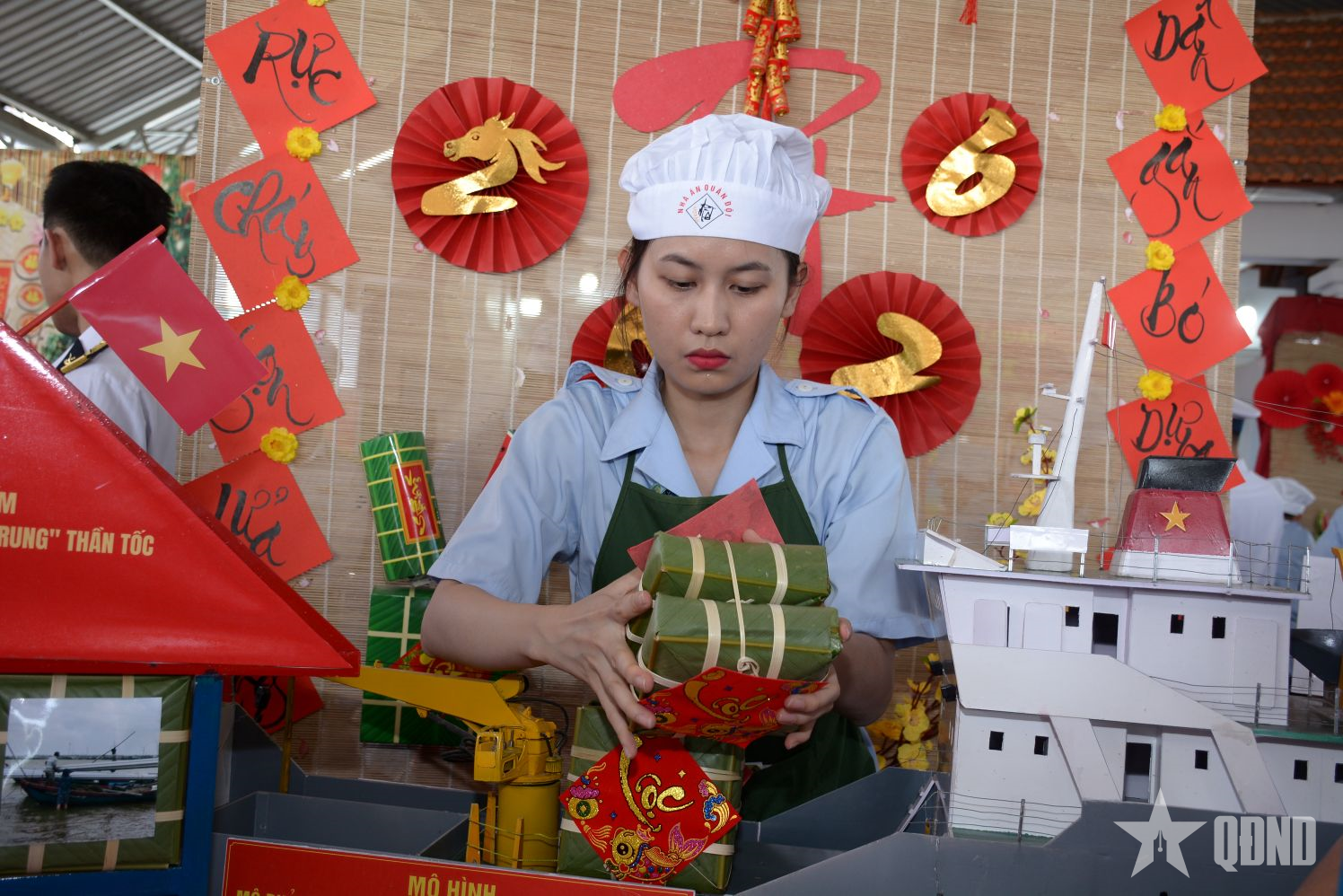 Niềm vui rạng ngời của Thiếu tá QNCN Nguyễn Thị Hà Huyền, nhân viên Thư viện Trung tâm Bảo đảm kỹ thuật khi tự tay gói nên những chiếc bánh chưng vuông vắn, nhỏ xinh.