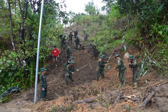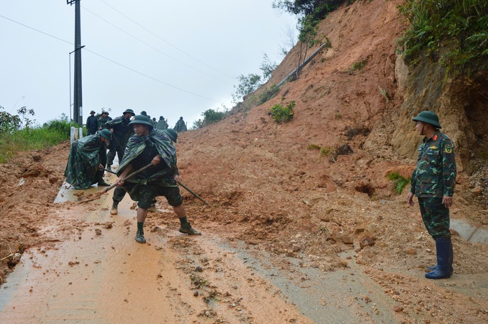 Trong điều kiện mưa lớn, đường trơn trượt, hàng chục cán bộ, chiến sĩ chia thành nhiều cánh quân, men theo triền đồi, lội qua những đoạn suối sâu để tiếp cận các thôn bị chia cắt. Không có máy móc hỗ trợ, họ dùng cuốc, xẻng để dọn đất đá, từng bước mở lối trên tuyến đường bị sạt lở.