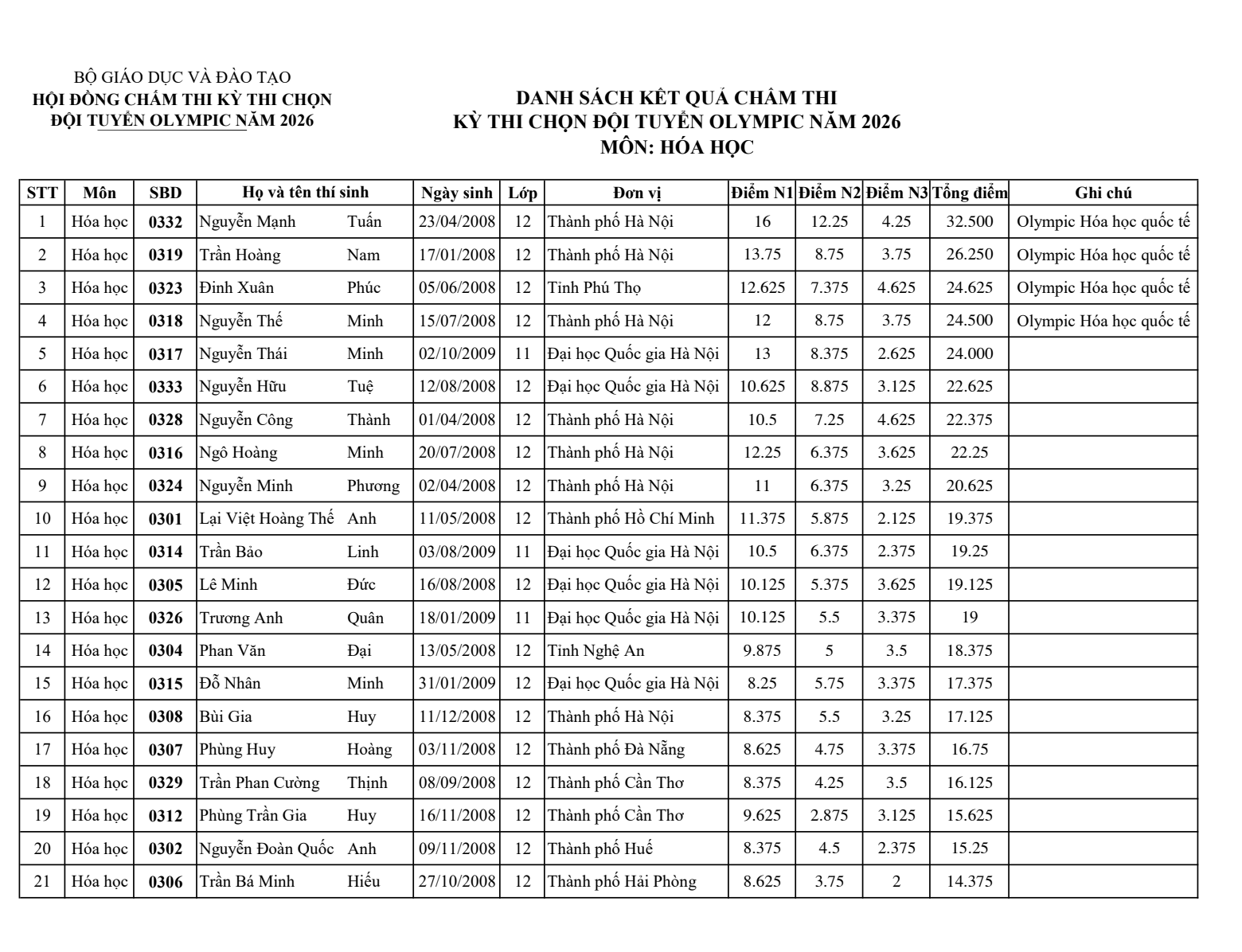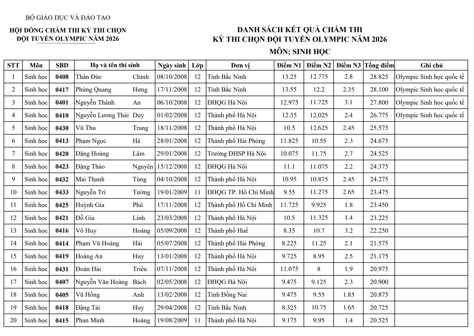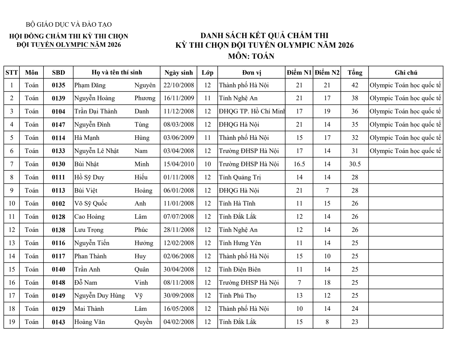 Danh sách những học sinh cùng điểm số ở vòng tuyển chọn dự thi Olympic năm 2026 các môn văn hóa như sau: