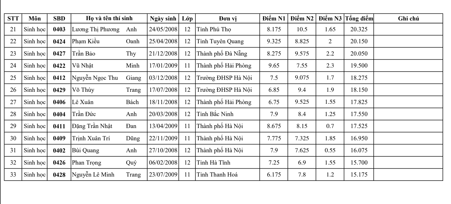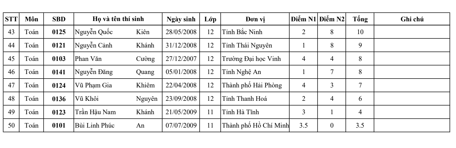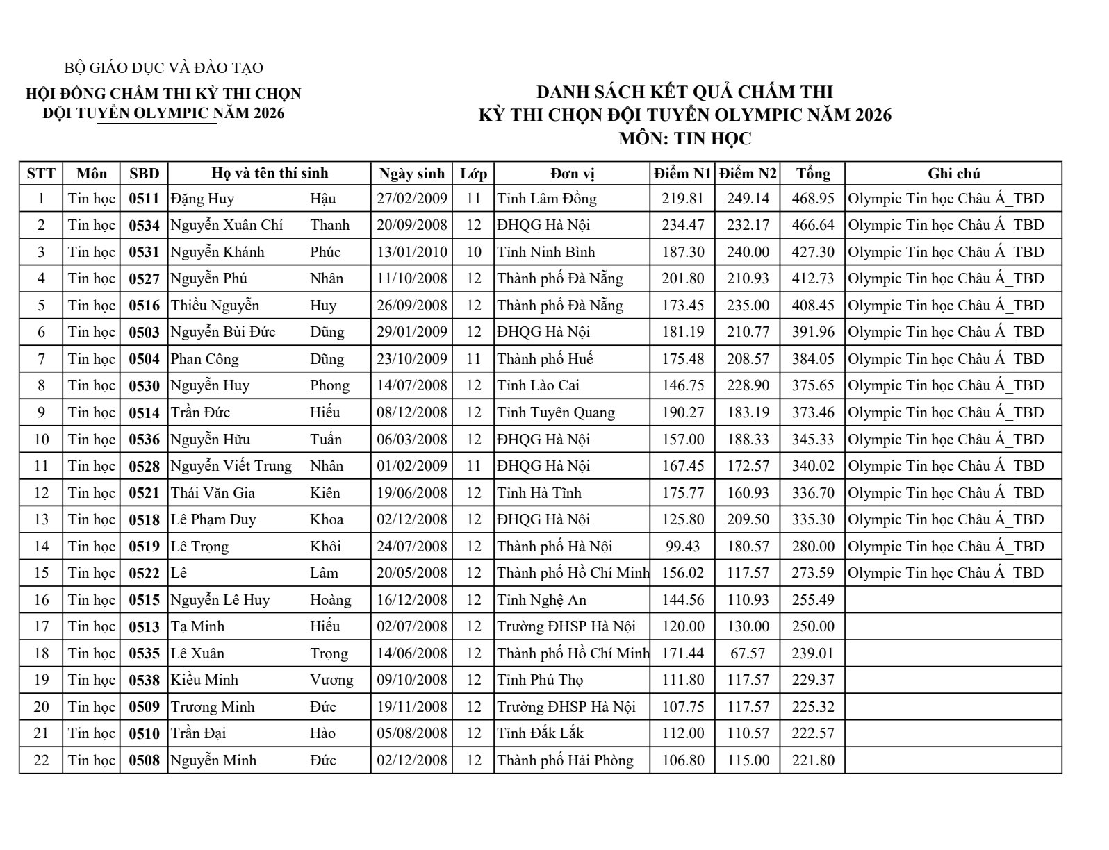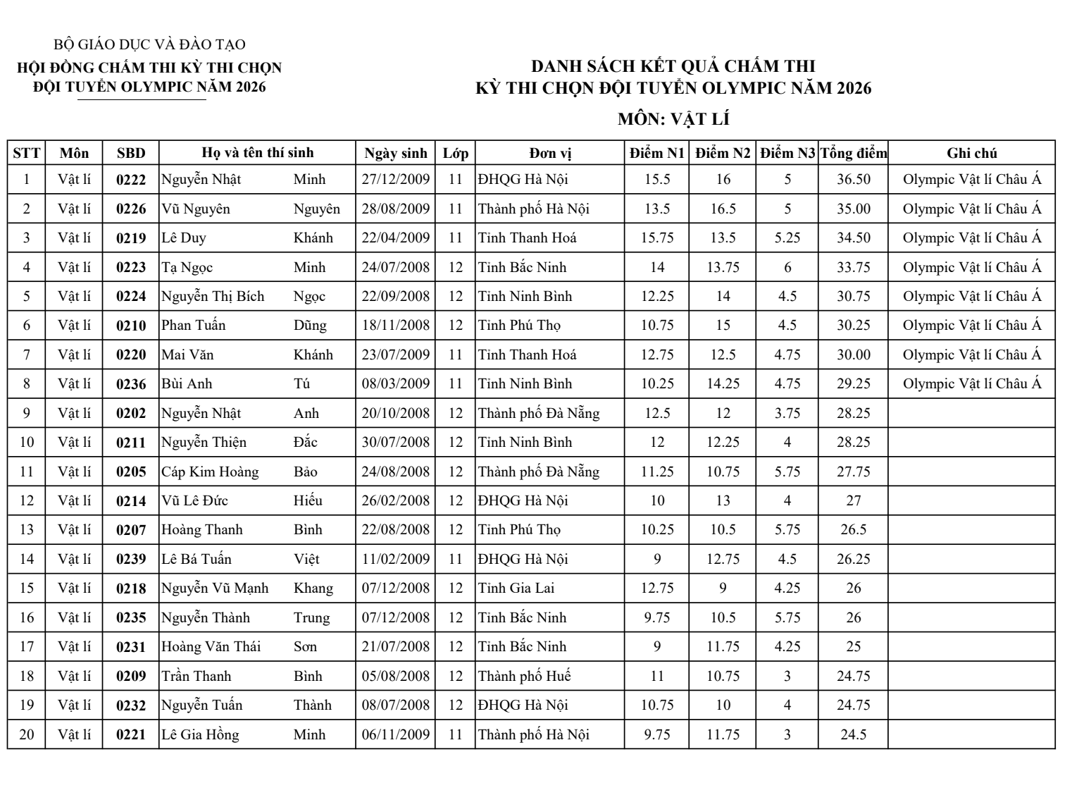 Danh sách những học sinh cùng điểm số ở vòng tuyển chọn dự thi Olympic năm 2026 các môn văn hóa như sau: