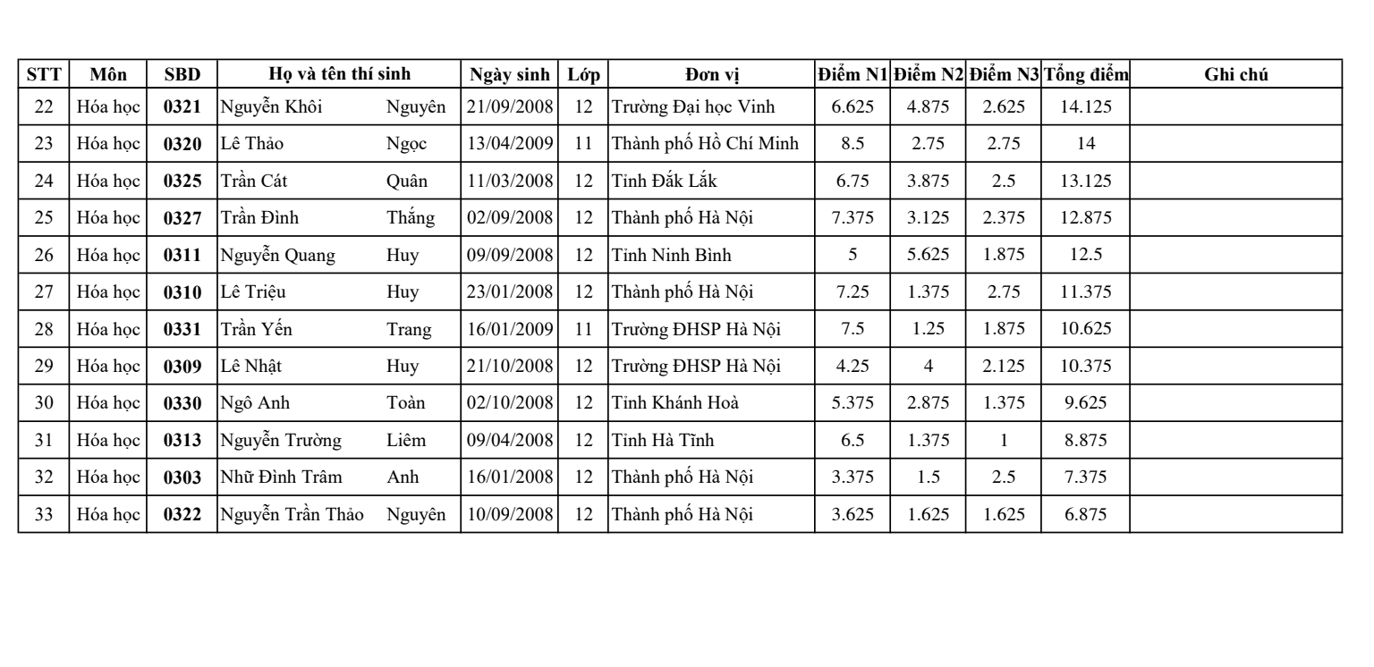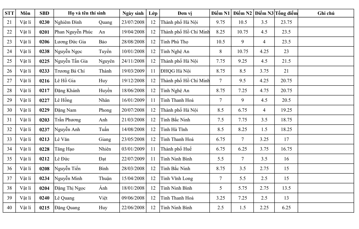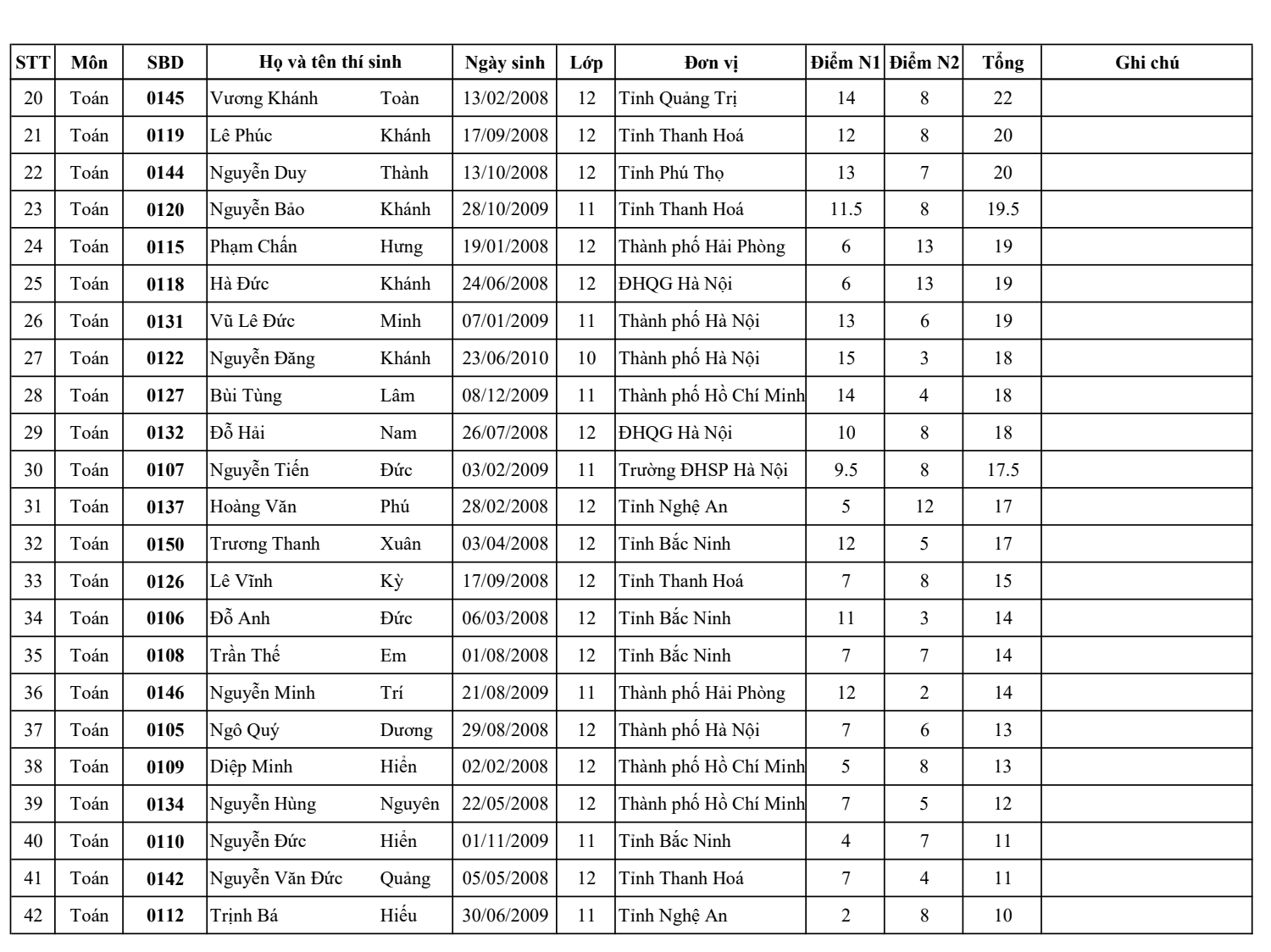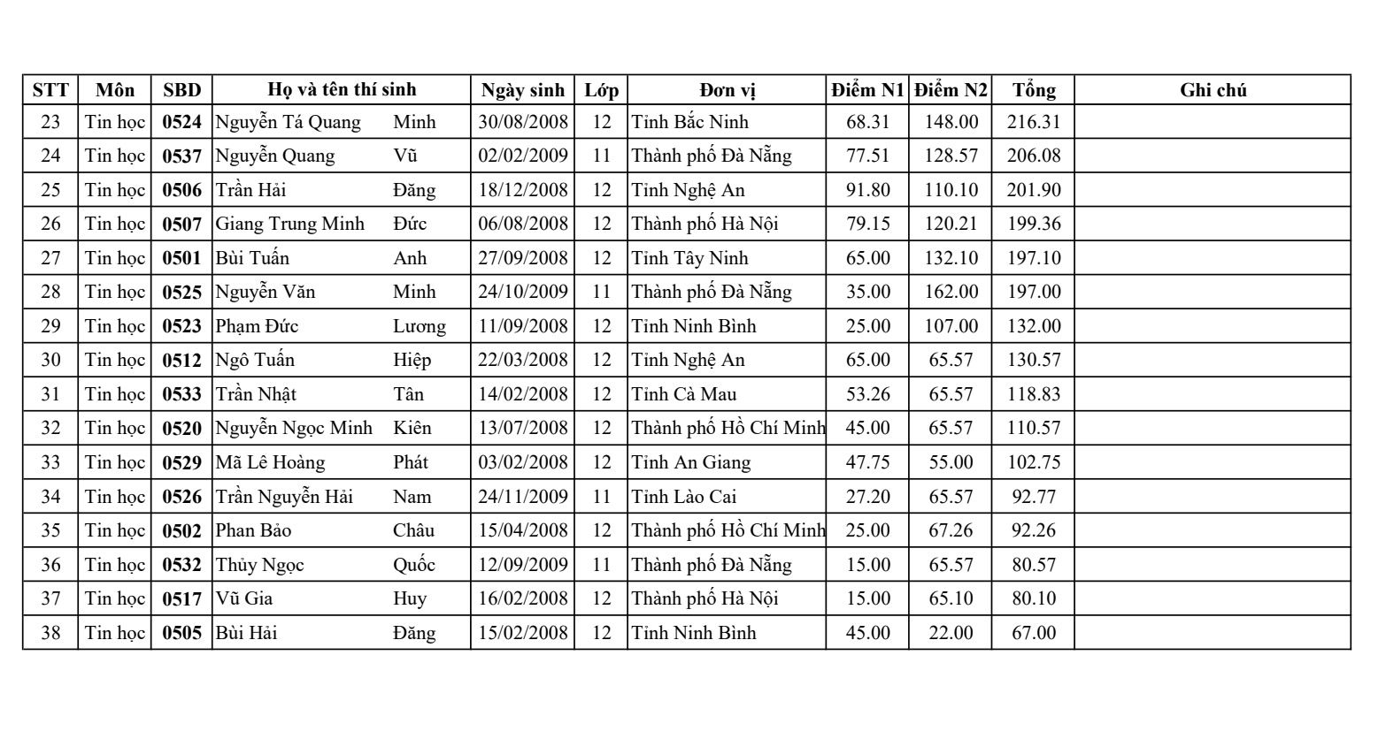 Danh sách những học sinh cùng điểm số ở vòng tuyển chọn dự thi Olympic năm 2026 các môn văn hóa như sau: