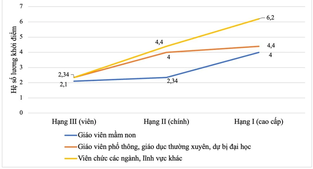 Đáng chú ý, chỉ tối đa 1,17% nhà giáo cao cấp được xếp ở thang lương cao nhất (A3.1 và A3.2), trong khi ngành khác đều có tối đa 10% viên chức được xếp thang lương A3.1.