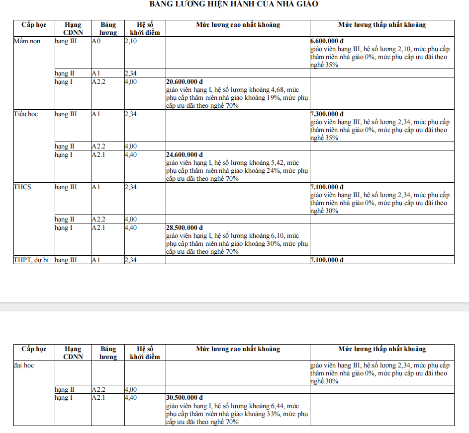 Lương của hầu hết nhà giáo (trừ giảng viên cao đẳng, đại học, giáo viên giáo dục nghề nghiệp) đang xếp thấp hơn viên chức các ngành khác như y tế (bác sĩ, dược sĩ), xây dựng (kiến trúc sư, thẩm kế viên), giao thông vận tải (kỹ thuật viên đường bộ, quản lý, bảo trì công trình…), tư pháp (lý lịch viên…), văn hóa – thể thao (đạo diễn, diễn viên, họa sĩ, huấn luyện viên…), khoa học công nghệ (nghiên cứu viên, kỹ sư), thông tin truyền thông (phóng viên, biên dịch viên, đạo diễn truyền hình).