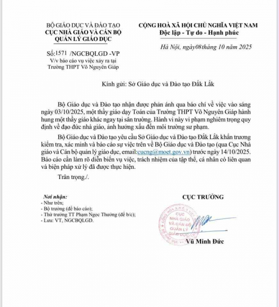 Cục Nhà giáo và Cán bộ quản lý giáo dục, Bộ GD&ĐT vừa có công văn gửi Sở GD&ĐT tỉnh Đắk Lắk, yêu cầu báo cáo vụ việc xảy ra tại Trường THPT Võ Nguyên Giáp, xã Ea Ô, tỉnh Đắk Lắk.