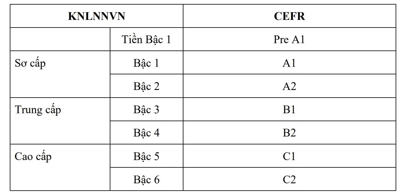 Dự thảo Khung năng lực ngoại ngữ dùng cho Việt Nam được phát triển trên cơ sở tham chiếu, ứng dụng CEFR và một số khung trình độ tiếng Anh của các nước, kết hợp với tình hình và điều kiện thực tế dạy, học và sử dụng ngoại ngữ ở Việt Nam. Khung năng lực ngoại ngữ Việt Nam được chia làm 3 cấp gồm sơ cấp, trung cấp và cao cấp.