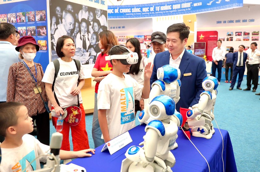 Học sinh thích thú trải nghiệm công nghệ AI tại triển lãm "80 năm giáo dục phát triển đất nước". Ảnh: Bộ Giáo dục và đào tạo