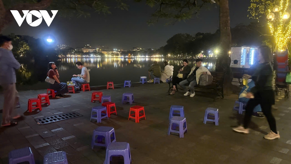Bàn ghế quán cóc phủ kín một đoạn dài bờ hồ Hoàn Kiếm tối 25/11, khiến lối đi bộ bị thu hẹp.