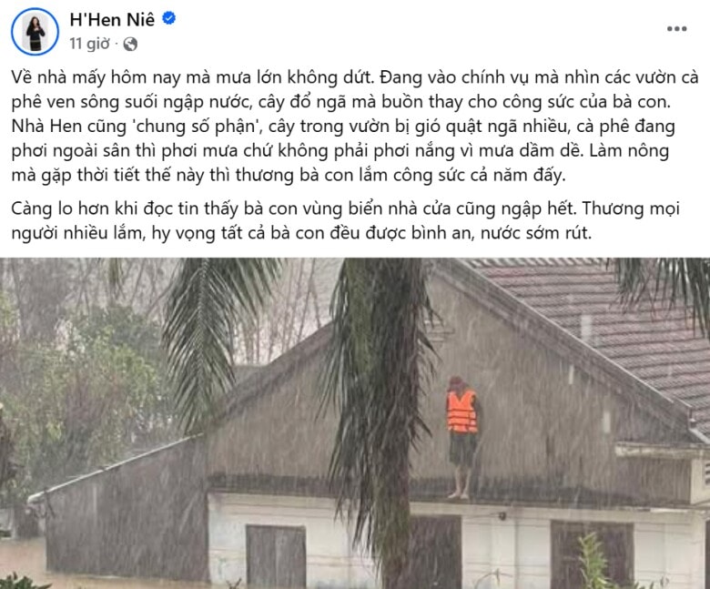 Sáng 20/11, Hoa hậu H'Hen Niê cho biết quê nhà cô ở Đắk Lắk cũng chịu thiệt hại nặng nề. Vườn cà phê của gia đình bị ngập nước, nhiều cây trồng bị ngã đổ ngay trong mùa thu hoạch, gây ảnh hưởng lớn đến công sức lao động của bà con.