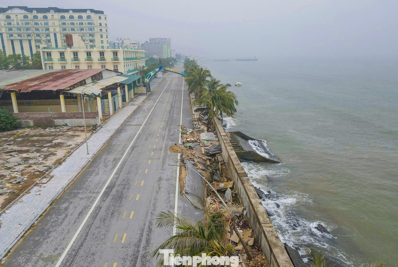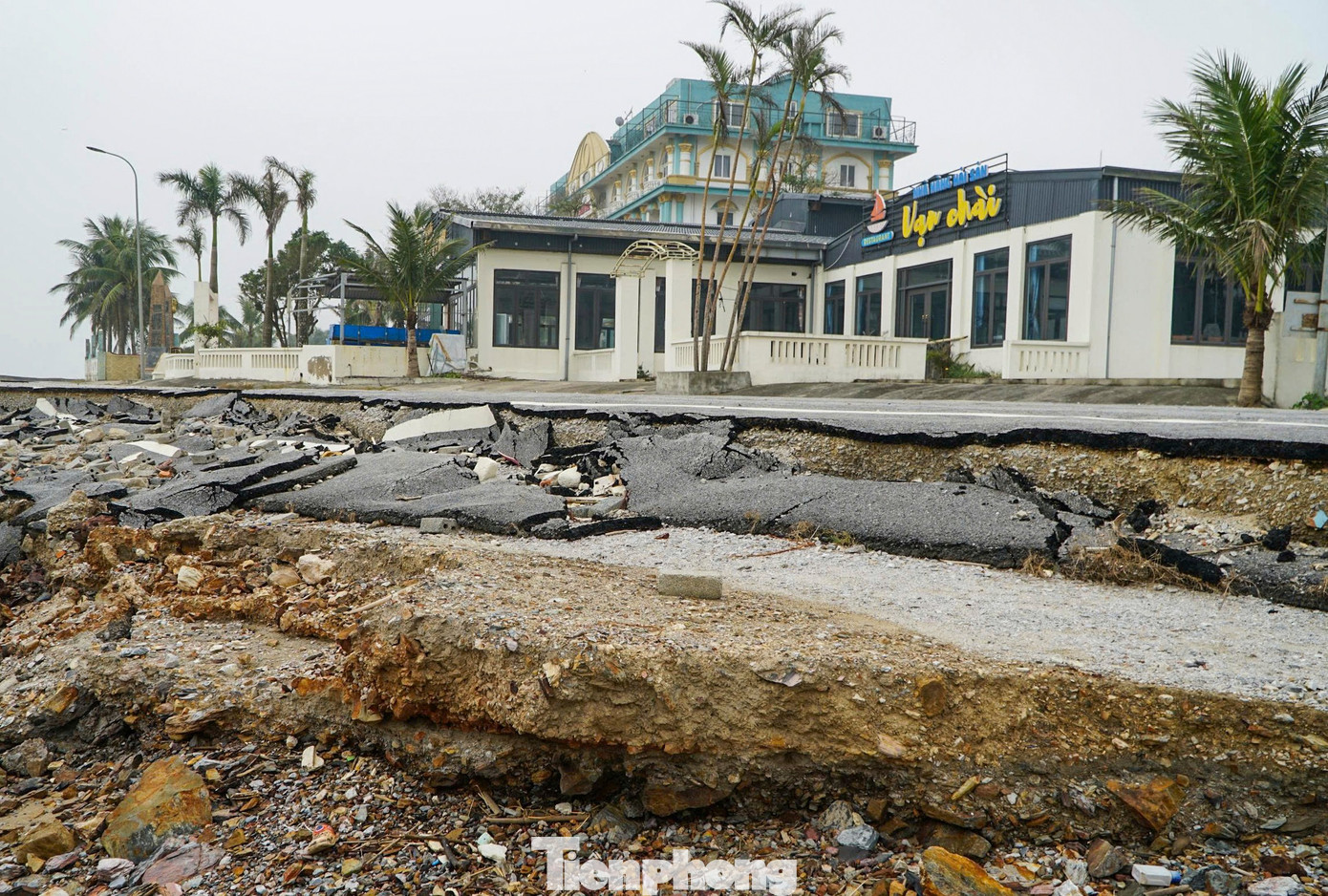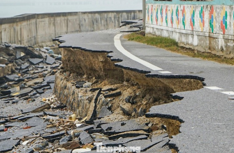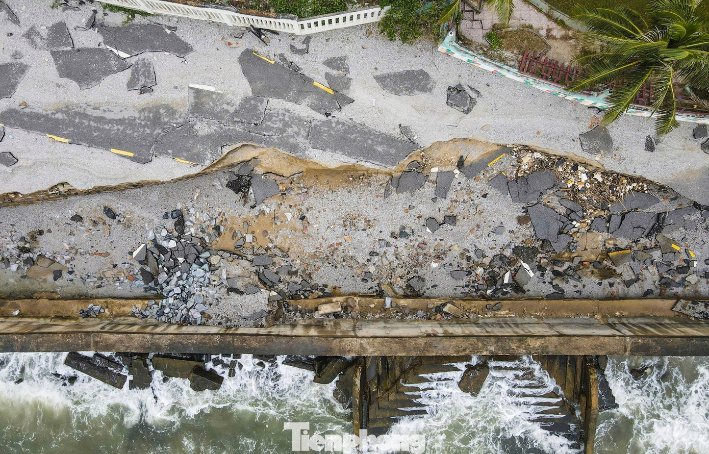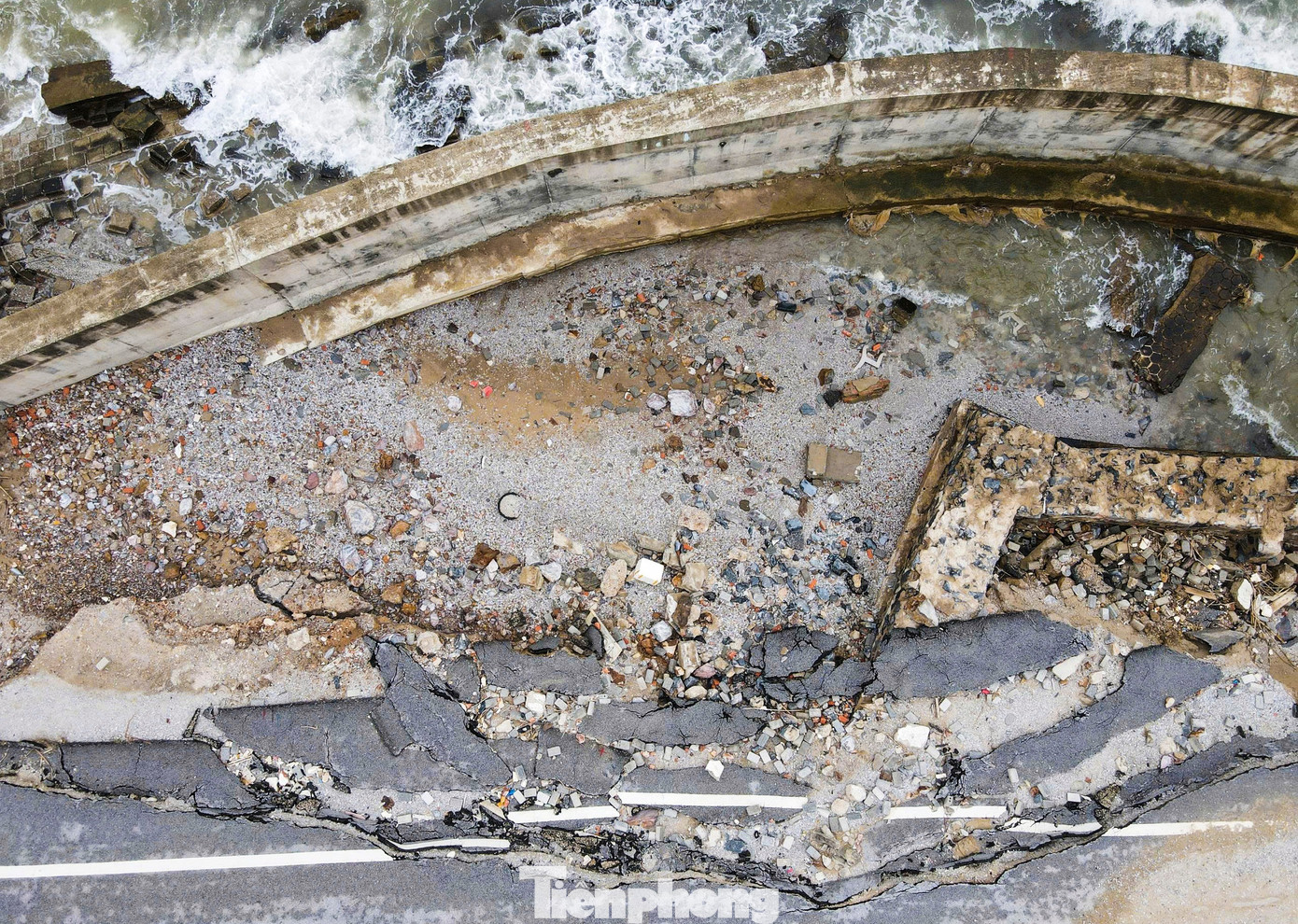 Nhìn từ trên cao, con đường dọc bờ biển bị gãy sập từng đoạn, ngổn ngang đất, đá, các phương tiện không thể lưu thông qua đây.