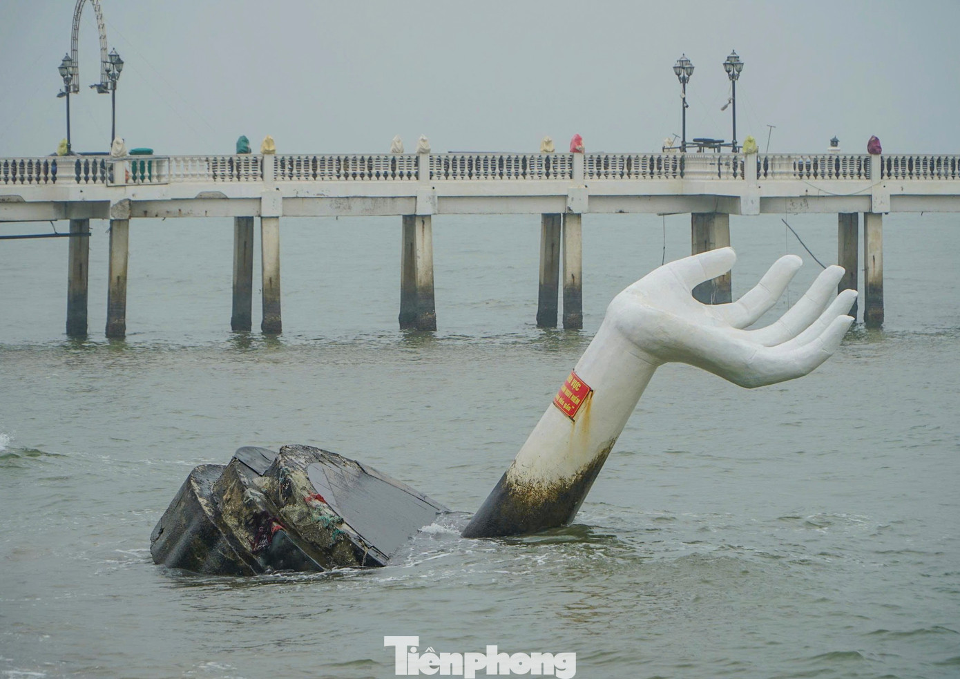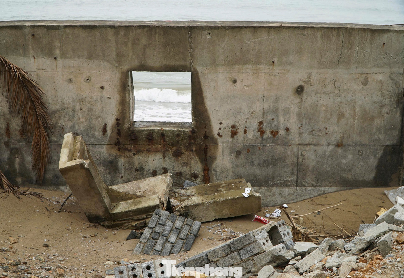 Chòi canh hình bàn tay bằng bê tông, cốt thép dưới bãi biển cũng bị sóng biển xô đổ ngả nghiêng. Chính quyền xã Hoằng Tiến cho biết có hơn 2 km bờ kè biển trên địa bàn bị sạt lở nghiêm trọng. Hồi tháng 9, UBND tỉnh Thanh Hóa đã ban bố tình trạng khẩn cấp một số điểm ở khu vực bãi biển Hải Tiến.