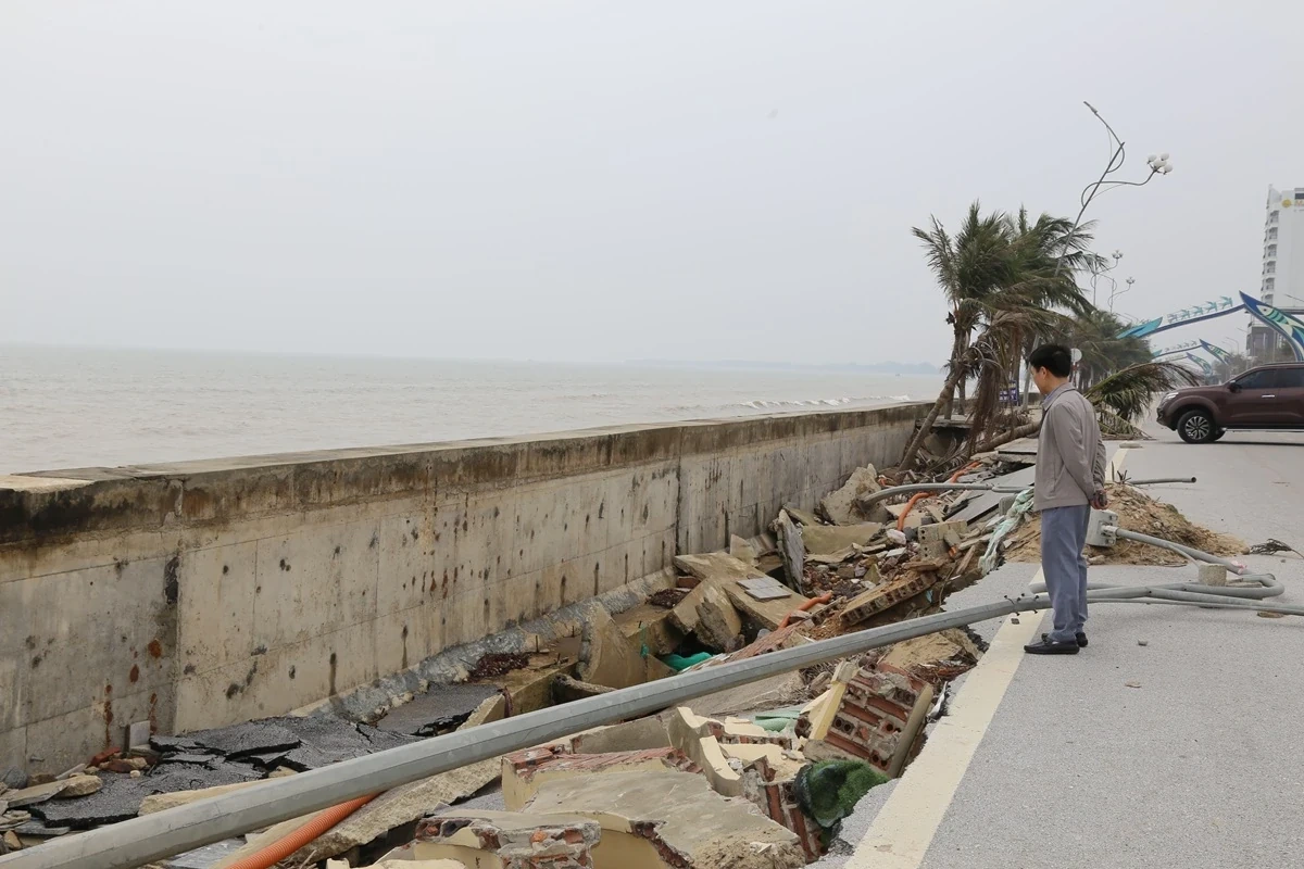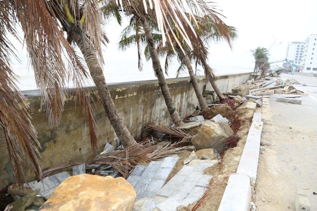 Ở nhiều đoạn, các khối bê tông bị sóng biển bẻ gãy nằm ngổn ngang dưới bờ biển, bờ kè nứt toác nham nhở. Sau khi mái kè bị sụt lún, nước biển tràn ngầm vào rút nền cát của đường bờ biển làm nhiều vị trí bị sụt lún lộ chân mố trụ.